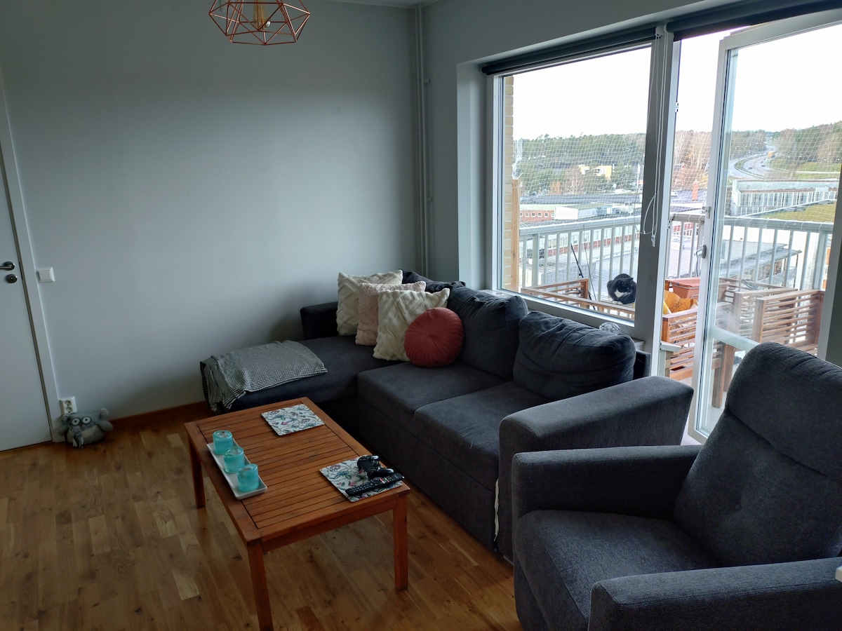 Välkommen som inneboende. Allmänt Gratis 12-timmars parkering & buss 4 min bort. Utanför finns grillplats & lekplats. I närheten finns badhus, naturreservat, kanotuthyrning, golfbana & skidspår. Kök Fullt utrustat, spis/ugn, kyl/frys, mikrovågsugn, brödrost, vatten- & kaffekokare. Badrum Dusch, tvättmaskin, torkställning & hårfön. Sovrum Dubbelsäng, byrå, skrivbord & kontorsstol. WiFi. Insiktsskyddad balkong. Vardagsrum Soffa, fåtölj, TV & matbord (10 personer). Netflix.