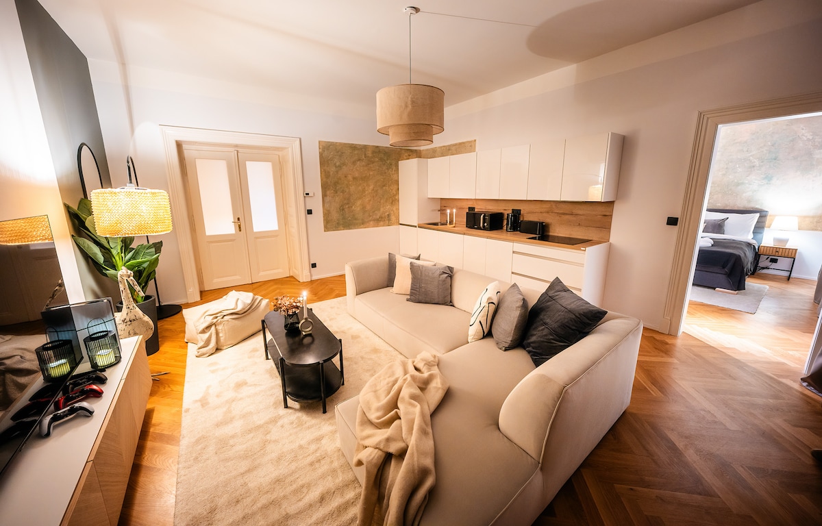 Նոր, շքեղ, մեկ ննջասենյակով բնակարան Պրահայի հին կենտրոնում ՝ վերջերս վերանորոգված պատմական շենքում ։ Բնակարանն ունի շատ ժամանակակից ինտերիեր ՝ դասական փայտե տարրերի հետ միասին ։ Կա հանգիստ ննջասենյակ ՝ երկտեղանի մահճակալով և բարձրորակ ներքնակով, լիովին կահավորված խոհանոց, հարմարավետ հյուրասենյակ ՝ բազմոցով և առանձին լոգասենյակով ։ Արագ ինտերնետ: Բնակարանը կատարյալ է երկու հոգու համար, բայց հարմարավետորեն հյուրընկալում է մինչև չորս հյուր: Շենքն ունի շուրջօրյա ընդունարանի աշխատակից և անվտանգության աշխատակից ։