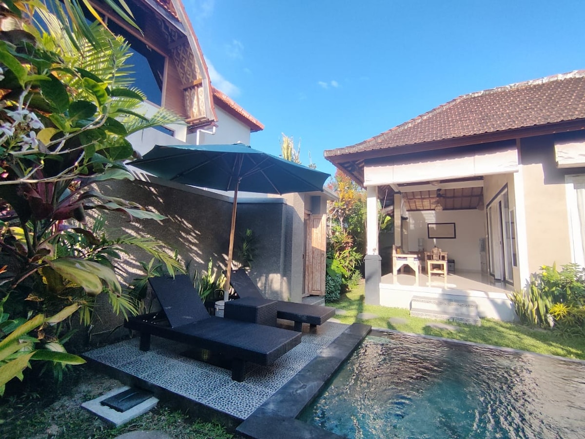 Om Swastyastu, Selamat Datang! Բարի գալուստ! Մենք ապրում ենք Penestan Kelod, հանգիստ գյուղում մոտ Ubud. Այստեղ դուք չեք լսի քաղաքի ծանր երթևեկությունը: Փոխարենը ՝ դուք շրջապատված եք բրնձի դաշտերով, փոքր խանութներով, ռեստորաններով, վիլլաներով և շատ բարեհամբույր մարդկանցով ։ Վիլլան կատարյալ է մեր տան մոտ գտնվող փոքրիկ նրբանցքում, որտեղ դուք կունենաք ձեր սեփական մտերմությունը ՝ առանց շատ մեկուսանալու: Դուք կունենաք առանձին լողավազան, խոհանոց մեծ ճաշասեղանով և 2 ննջասենյակ սեփական լոգասենյակով և A/C