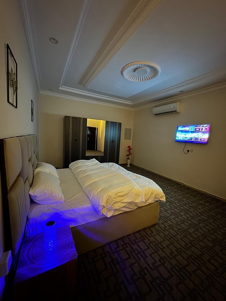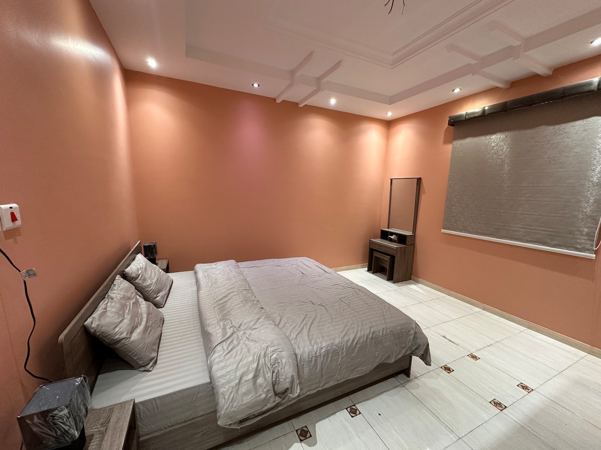 A luxurious one-bedroom apartment featuring a room and a bathroom, with a calm, hotel-style design for maximum comfort. It includes high-speed internet, a 65-inch smart TV, a refrigerator, microwave, and kettle. A high-quality mattress topper is also provided to ensure a comfortable sleep. The property enjoys a prime location close to all amenities and near a large mosque.