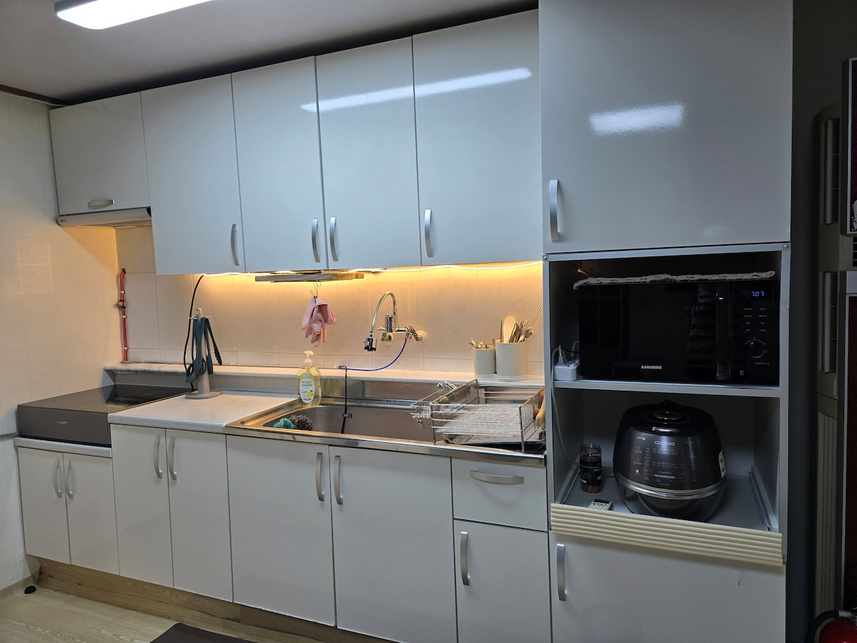 Այն հիանալի տարածք է ամբողջ ընտանիքի համար ։ Այն կարող է տեղավորել 2 - ից մինչև 6 հոգի ։ Կա 3 սենյակ, և յուրաքանչյուր սենյակ հարմարավետ և միապաղաղ է, որպեսզի ձեզ չանհանգստացնի բավարար քունը: Խոհանոցը հագեցած է խոհանոցային պարագաներով, ինչպիսիք են բրնձի եփուկը և օդի տապակիչը, այնպես որ կարող եք պատրաստել պարզ սնունդ: Անգունը գտնվում է Ջոդոնգում, որը շատ սնունդ և տրանսպորտ ունի Ուլլյունգդոյում: Կացարանի անմիջապես դիմաց հոսանք կա, այնպես որ կարող եք զբոսնել առավոտյան և երեկոյան ։ Կացարանի հարևանությամբ կա մթերային խանութ, իսկ Հանարո Մարտը, Սաշիմի ռեստորանը, Ռեստորանի ծառուղին և լաստանավային տերմինալը գտնվում են մոտ 5 րոպե հեռավորության վրա ։ Այն գտնվում է քաղաքի կենտրոնին մոտ գտնվող բնակելի համալիրում, ուստի ունի լավ հարմարություններ և հարմարավետություն ։ Մենք կպատրաստենք ընկերական և ջերմ տարածք, որպեսզի կարողանաք զվարճալի հիշողություններ ունենալ կանաչ և խաղաղ Ուլյունգդոյի մասին: