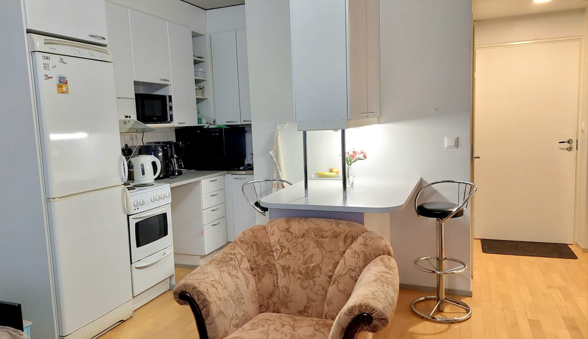 Բնակարանը հարմարավետ մեկ սենյականոց հարմարավետ մեկ սենյականոց բնակարան է, որը գտնվում է Կուվոլայի կենտրոնից մոտ տասը րոպե հեռավորության վրա գտնվող հանգիստ բնակելի տարածքում ։ Ննջասենյակում կա երկտեղանի մահճակալ, իսկ հյուրասենյակի բազմոց - մահճակալը նախատեսված է երկու հյուրի համար ։ Բնակարանի բաց խոհանոցը լավ կահավորված է և կատարյալ է ավելի երկար այցերի համար ։ Բնակարանն ունի շոգեբաղնիք և ապակեպատ կահավորված պատշգամբ, որը հարմարավետ է շոգեբաղնիքից հետո զովանալու համար: Փողոցում կա անվճար կայանելու տեղ: