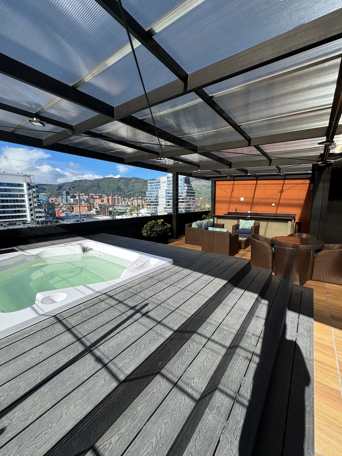 Despierta con los Cerros Orientales frente a ti. Nuestro loft está ubicado en el edificio más icónico de Chapinero, una torre de vidrio que captura la ciudad desde todos los ángulos. El apto combina diseño, amplitud y luz natural en un solo espacio. Ventanales de piso a techo, terraza privada, wifi de 600 Mbps y zona de trabajo para quienes mezclan viaje con productividad. Afuera, todo Chapinero a pie: Parque de los Hippies, Carrera7, restaurantes de autor, cafés de especialidad y vida nocturna.