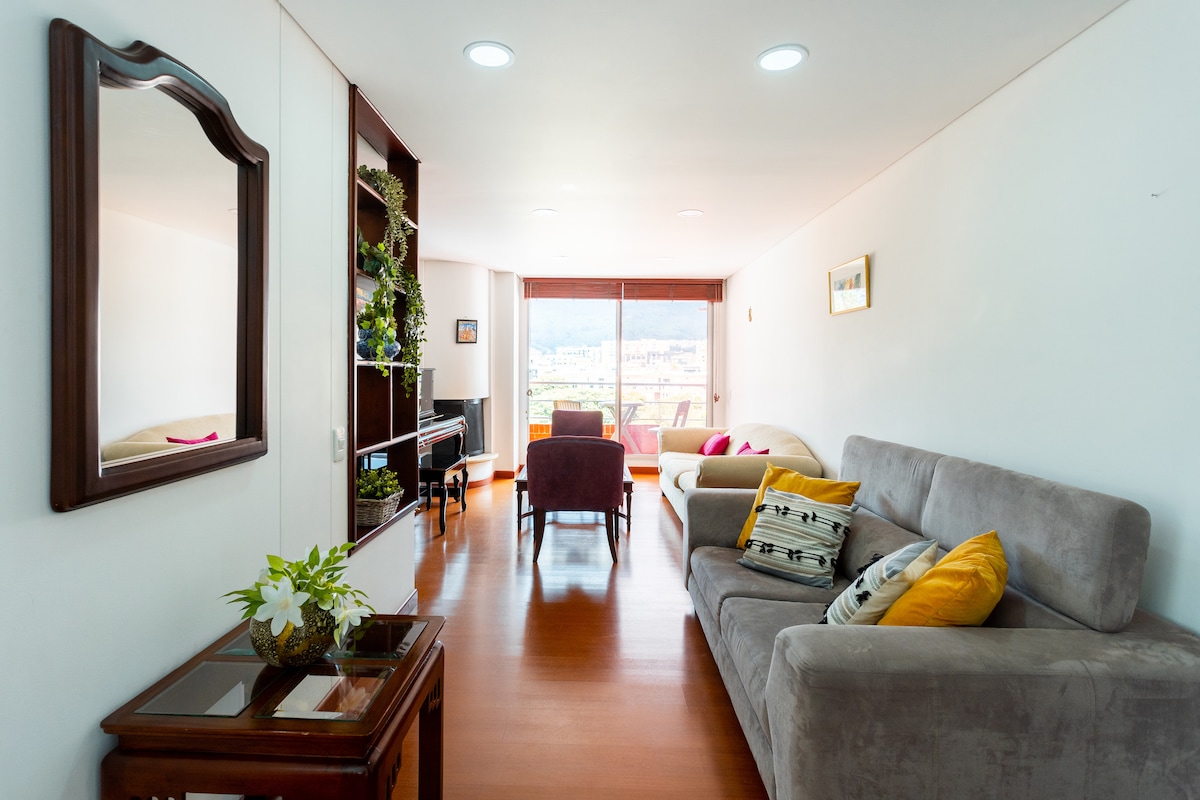 This light-filled apartment welcomes you each morning with a stunning view of the Bogotá sunrise. Just steps from Unicentro, it's designed to offer comfort, calm, and privacy, whether you're here on vacation, for work, or recovering from a medical procedure. Nearby you'll find clinics, shopping centers, parks, and restaurants. Perfect for those seeking well-being, a great location, and a beautiful place to stay.