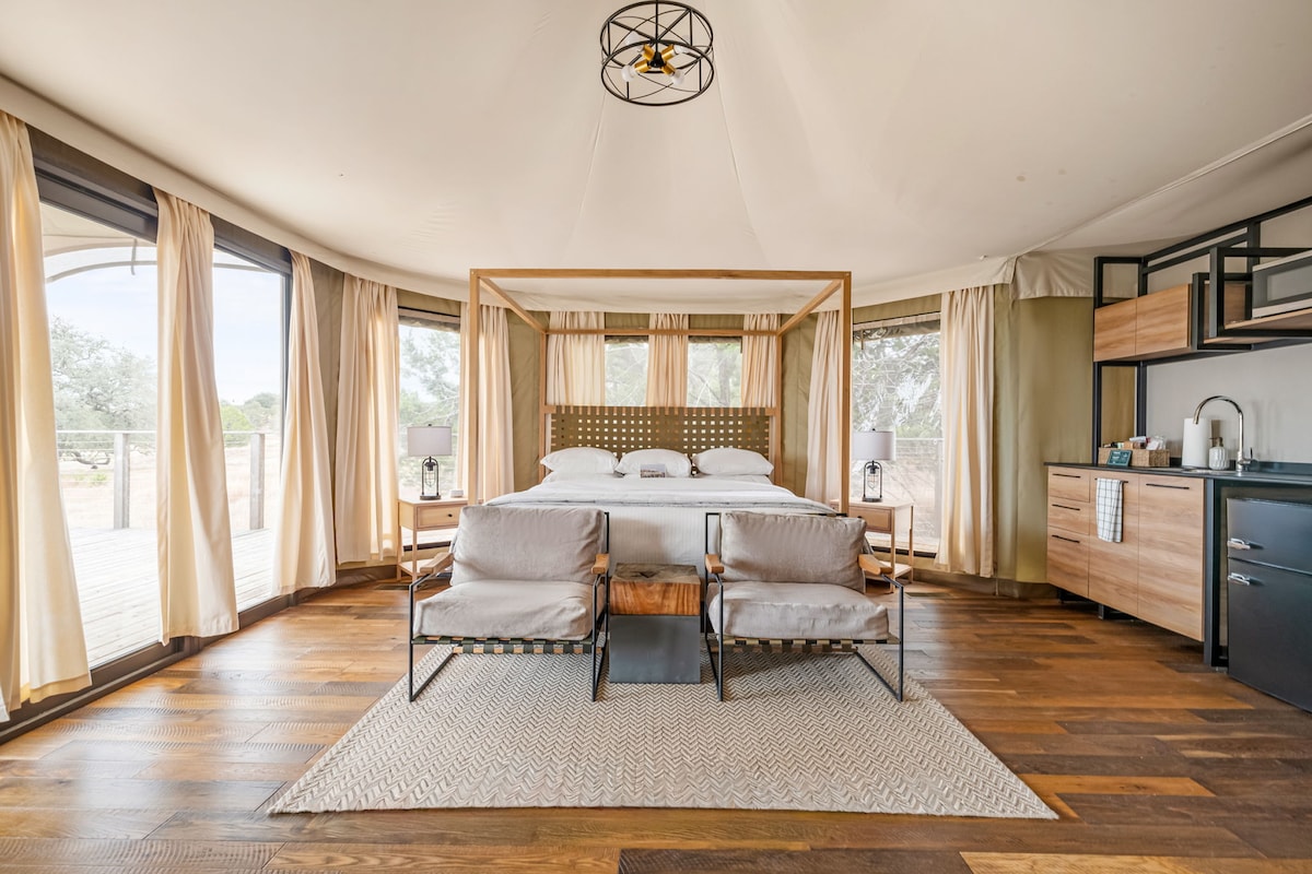 Փախեք դեպի Տեխաս Հիլ Քենթրիի համերաշխ գեղեցկությունը Ashley's View - ում, որտեղ գյուղական բացօթյա կյանքը համապատասխանում է ժամանակակից հարմարավետությանը: Այս շքեղ զանգի վրանը անմոռանալի փորձառություն է առաջարկում բնության սիրահարներին և արկածներ փնտրողներին ։ Մեր ընդարձակ գլեմփինգ վրանում կա հարմարավետ երկտեղանի մահճակալ, որը կատարյալ է գիշերային հանգիստ քնելու համար ։ Այն լիովին հագեցած է սառնարանով, օդորակիչով, միկրոալիքային վառարանով և Keurig սուրճի ապարատով, որպեսզի ձեր այցը հնարավորինս հարմարավետ լինի ։