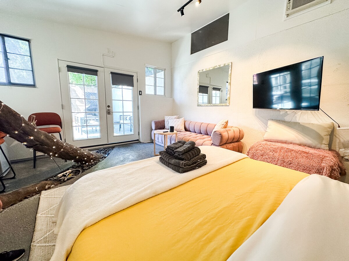 Welcome to your LA retreat! This chic studio apartment in Burbank is just minutes away from Universal Studios, Burbank Studios & Disney. This space offers effortless living. Enjoy stylish furnishings, a fully-equipped kitchen, Wi-Fi & a smart TV, queen beds, on-site laundry, street parking, & ongoing support, convenience is assured. Located across from Whole Foods. You’re at the heart of LA’s vibrant culture. Show up & live the LA dream! Easy Free Street Parking.