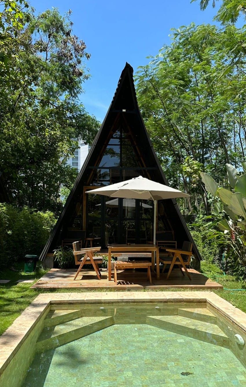 Արևադարձային փայտե բունգալո, մասնավոր այգի և լողավազան