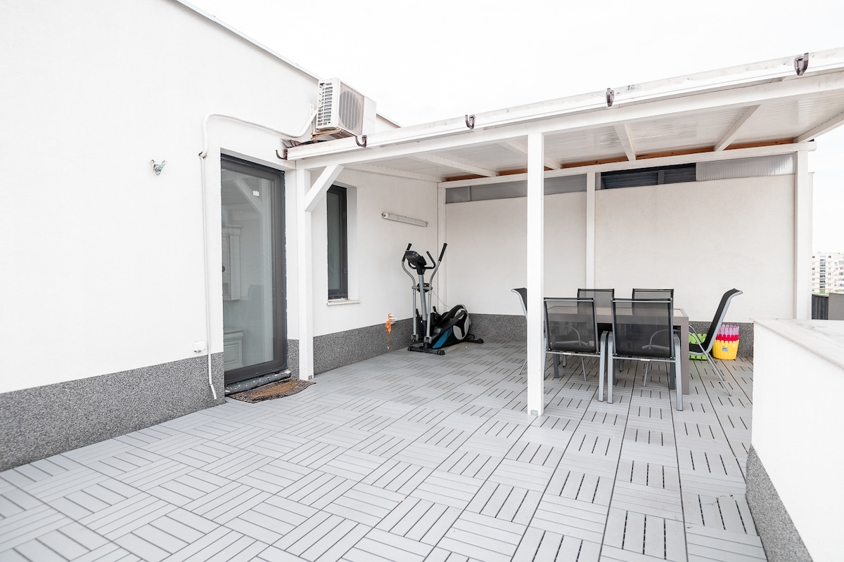 Նոր վերանորոգված այս 120 մ² մակերեսով բնակարանը ունի 150 մ² մակերեսով առանձին բակ ՝ այն դարձնելով իսկապես յուրահատուկ բնակելի տարածք Բուխարեստում ։ Իդեալական է մեծ խմբերի կամ բիզնես ուղևորների համար ՝ 3 ընդարձակ ննջասենյակ, լիովին կահավորված խոհանոց, գեղեցիկ այգի, գեղեցիկ դրսի տեռաս և գրիլ ։ Սեփականատերը պրոֆեսիոնալ կերպով մաքրվում է յուրաքանչյուր այցից հետո ։ Բնակավայրը գտնվում է հանգիստ և կանաչ տարածքում ՝ HardRock Cafe - ի, Romexpo - ի և Herastrau Park - ի մոտակայքում ։ Առկա է 3 անվճար կայանատեղի:
