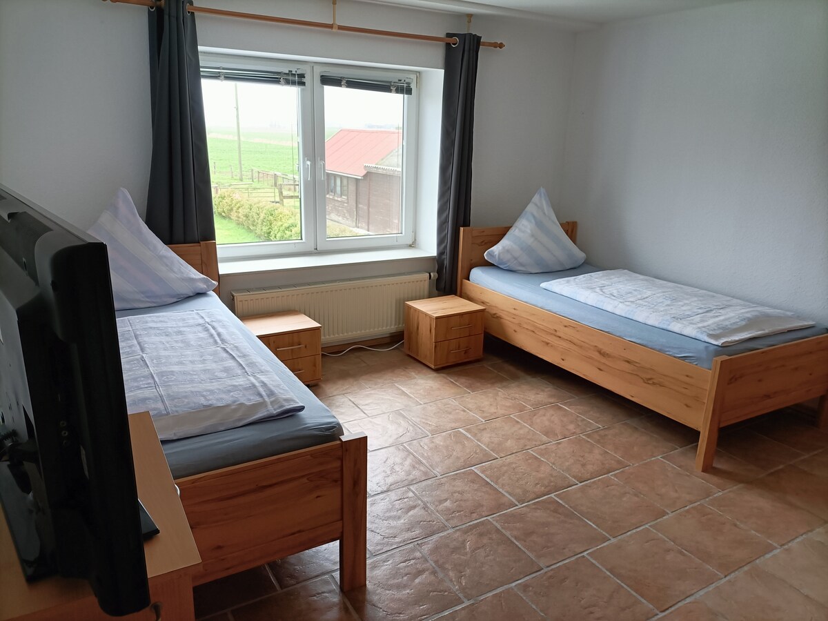Wir wohnen in einem Bauernhof in ruhiger Alleinlage mitten in Ostfriesland mit unseren Rindern, Pferden, Hühnern, Hunden und Katzen. Einkaufsmöglichkeiten und Restaurants gibt es in 2 km Entfernung. Und jede Menge Radwege zu lohnenden Zielen - Badeseen, Freilichtmuseen, Kletterpark.... Wir geben euch gerne Tipps. Für unsere Gäste stehen zwei Schlafräume zur Auswahl - ein Einzelbett und ein Queensize-Bett. Wir sind Nichtraucher und bitten unsere Gäste auf das Rauchen im Haus zu verzichten.