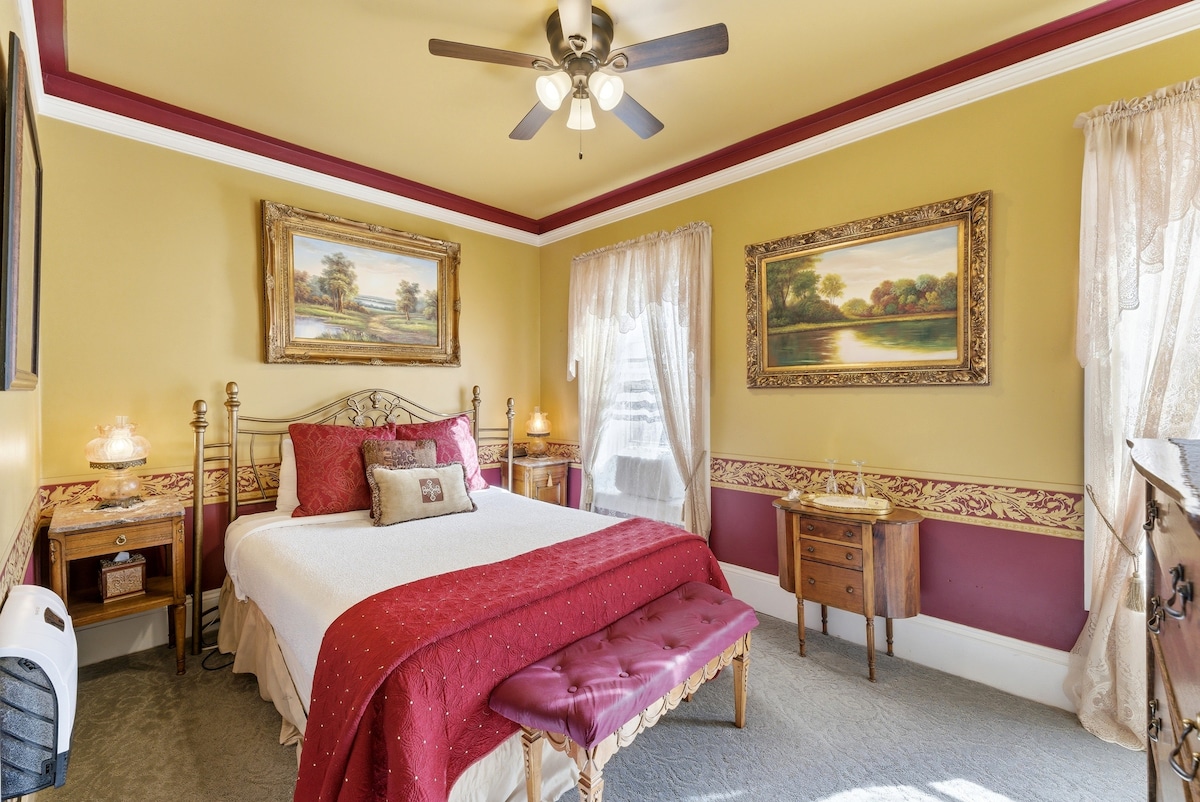 Guest favorite featuring authentic Victorian-era décor, an original early-1900s clawfoot bathtub, and a charming bay window reading nook. Located on the top floor with Tiffany-style lighting, a work desk, and modern amenities. Perfect for history lovers, remote workers, or anyone seeking old-world charm with contemporary comfort. Includes: Queen bed, original clawfoot tub, bay window nook, desk/workstation, mini-fridge, TV, Wi-Fi, in-room safe, independent climate control, bath essentials.
