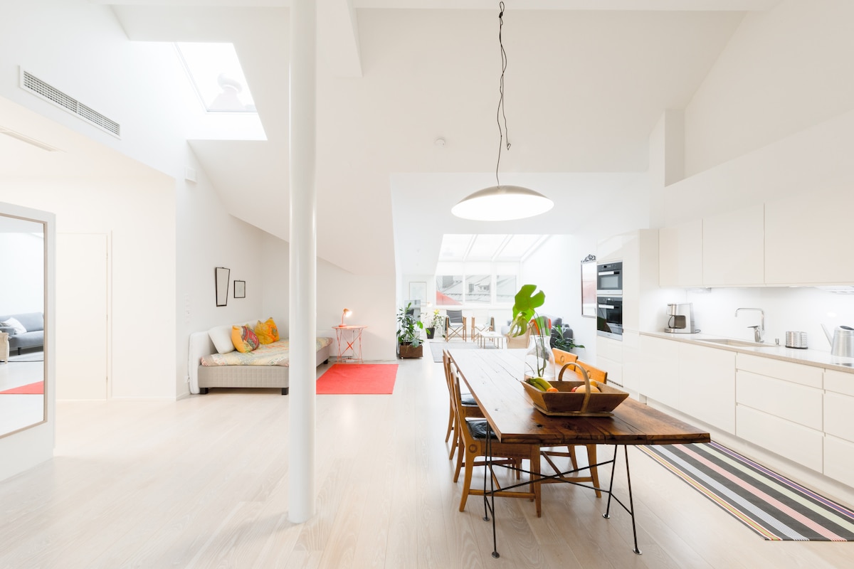 Architect-designed 132 m² loft on 6th floor featured in magazines and on TV. Open 90 m² living space with a 15 m² west-facing terrace and an east-facing balcony offering stunning rooftop views. Includes a dining table for 20, 86" TV, piano, and workspace. Spa-style bathroom with sauna and whirlpool opens to the loft. Sleeps up to 6: double bed in the loft, kids’ room with double bed and balcony bed, plus a sofa bed. Stylish, spacious, and unique—finalist in Finland’s Most Beautiful Home 2013.