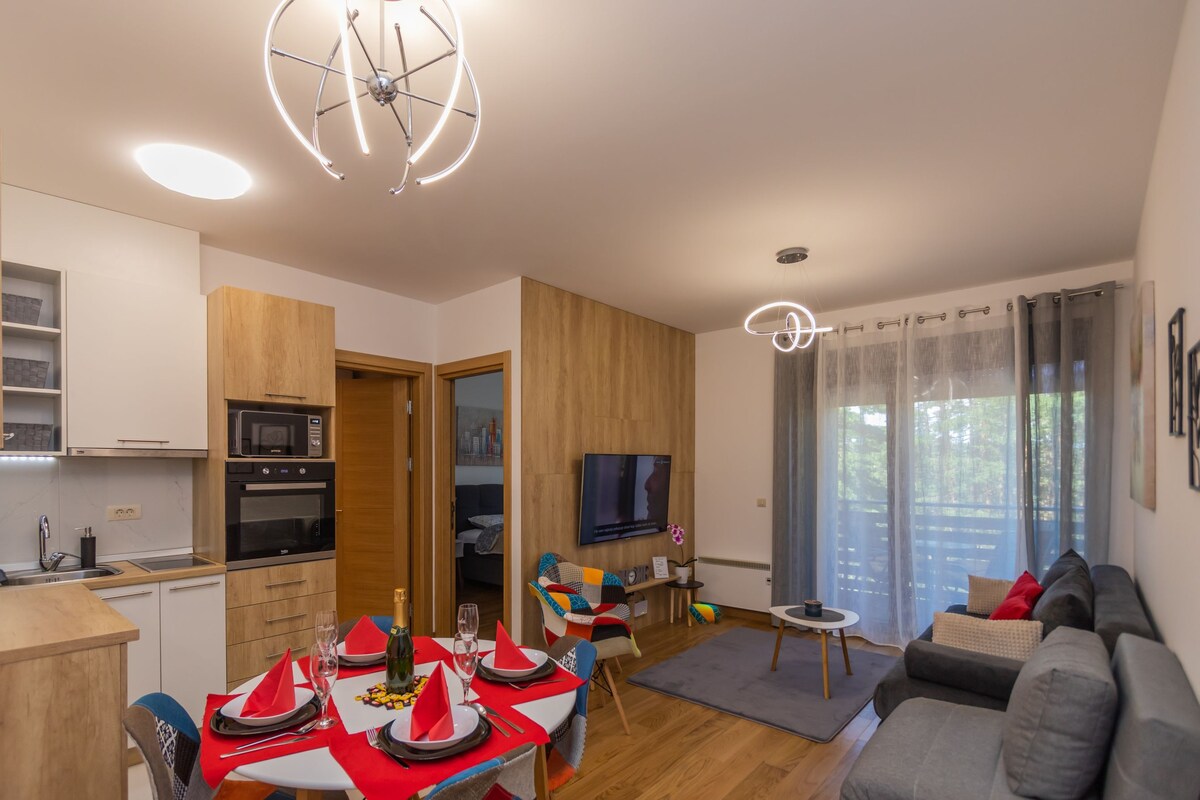 Բնակարանը գտնվում է 2-րդ հարկում, վերելակով շենքում, կարող է տեղավորել 4 հոգի, գտնվում է Զլատիբորի խաղաղ մասում, լճից և կենտրոնից ընդամենը 5 րոպե հեռավորության վրա: Այն ունի 2 առանձին սենյակ՝ հյուրասենյակ և ննջասենյակ (երկու մահճակալ 160x200) + լրացուցիչ մահճակալ՝ ամբողջական սպիտակեղենով մանուկների համար: Սրբիչներ և անկողնային պարագաներ յուրաքանչյուր հյուրի համար առանձին։ Տեռաս՝ լեռնային տան և բնության տեսարանով։ Գերարագ ինտերնետ և կաբելային հեռուստատեսություն՝ ավելի քան 100 ալիքով, 2 հեռուստացույցով։ Լիովին կահավորված խոհանոց։ Ավտոկայանատեղի՝ տեսահսկմամբ։