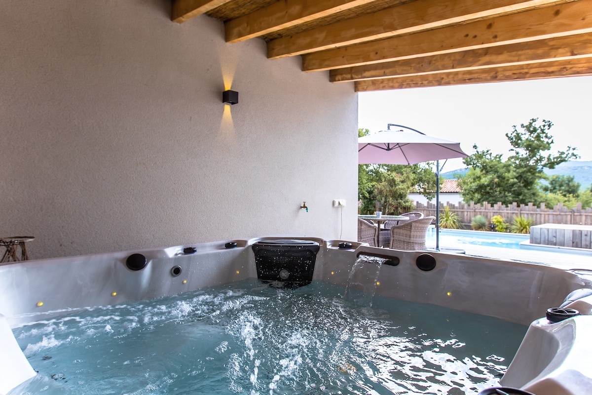 Շատ հարմարավետ վիլլա ջակուզիով և մասնավոր լողավազանով. խաղաղության ապաստարան Արդեշում Համտեսեք բարեկեցություն և խաղաղություն հարավային Արդեշի սրտում գտնվող այս վիլլայում ։ Գնահատված 4 աստղ ․ այն ունի այն ամենը, ինչ անհրաժեշտ է անմոռանալի այցի համար. Առանձին ջակուզի Ջեռուցվող և պաշտպանված լողավազան (ըստ ցանկության ՝ մայիսի կեսերից մինչև սեպտեմբերի կեսերը) Լայնէկրան հեռուստացույց և անվճար Wi - Fi Պետանկի կորտ ընկերական պահերի համար Կատարյալ միջավայր ՝ մարտկոցները վերալիցքավորելու համար
