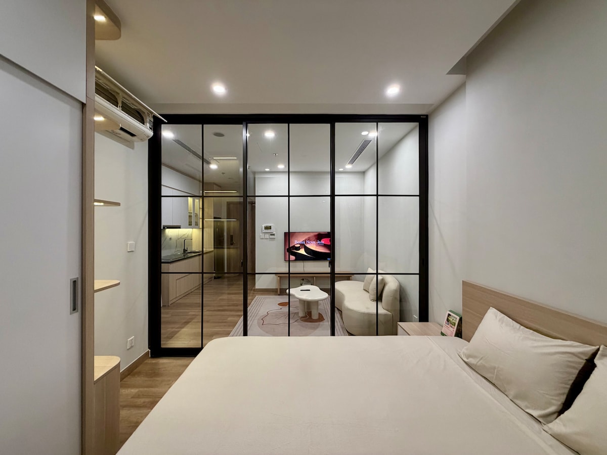 Experience 5-star inspired luxury in this stylish grey-toned studio, featuring a glass-walled bathroom, raw stone accents, and premium finishes. Perfectly located in the heart of Ecopark, just 3 minutes to Swan Lake and 30 minutes to Hanoi Old Quarter, with restaurants, cafés, and shops right at your doorstep. Equipped with Dyson fan, Bluetooth speaker and modern amenities; plus access to the gym and swimming pool on the 3rd floor — perfect for an elevated stay.