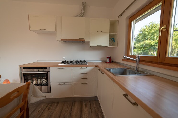 Մոտ 75 քմ մակերեսով բնակարան, շատ հանգիստ տարածք ՝ փակ կայանատեղով, ջերմային վերարկուով և նոր պատուհաններով, որոնք գտնվում են բնակելի տան առաջին հարկում, առանձին այգի ՝ Կալդոնացո լճի տեսարանով ։ Ինքնամփոփ հատակ, ունի հյուրասենյակ ՝ լավ կահավորված խոհանոցով, երկտեղանոց ննջասենյակ, երկու առանձին մահճակալներով սենյակ, լրացուցիչ մահճակալ, լոգասենյակ ՝ լվացքի մեքենայով և պահարանով ։ Առաջարկը ներառում է Wi - Fi, սպիտակեղեն ՝ շաբաթական փոփոխությամբ ։
