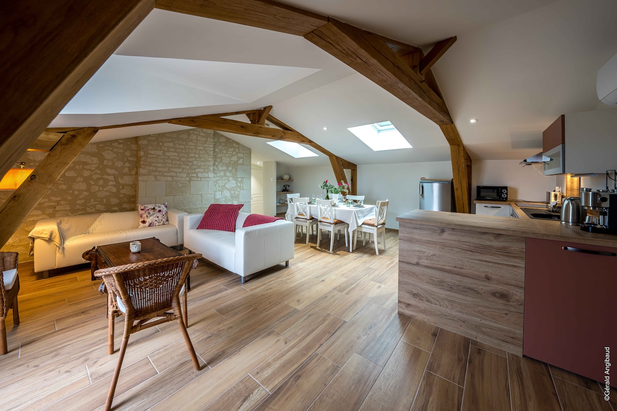 Au sein du Domaine de l'Enchantoir, notre vignoble biologique, séjournez dans notre Refuge, un appartement de 4 pièces entièrement rénové et pensé pour votre confort. Il se trouve au 1er étage de notre vieux Logis du 15è. Cet appartement est composé de 3 chambres. La cuisine ouverte sur le salon.Toutes les chambres sont équipées de la climatisation. Table extérieure, billard et salon de lecture pour la détente. Linge de lit, serviette, savons, gel douche et shampoing compris.