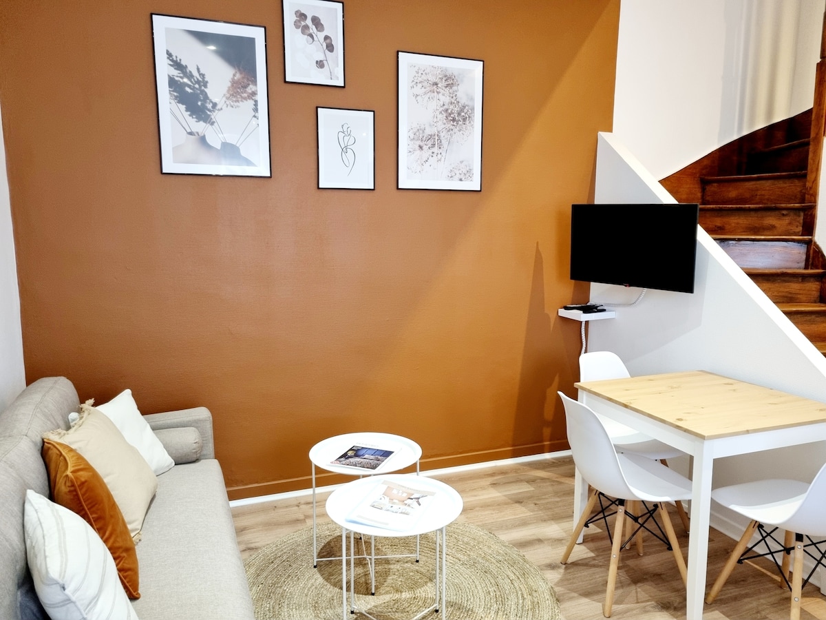 Բարի գալուստ Անգուլե քաղաքի սրտում գտնվող սարահարթ ։ Իդեալում, որը գտնվում է տաճարի թաղամասում, այս հոյակապ և ջերմ թաունհաուսը ողջունում է ձեզ երիտասարդացնող հանգստի համար ։ 60 մ2 մակերեսով այս լուսավոր տունը գտնվում է քաղաքապետարանի հրապարակից 350 մ հեռավորության վրա, ՍԿՖ կայարանից 1.3 կմ հեռավորության վրա, տաճարից և թանգարանից 150 մ հեռավորության վրա: Հանգստի կամ պրոֆեսիոնալ հանգստի համար օգտվեք նրա ներքին բակից, մեծ ննջասենյակից ՝ 180 սմ մահճակալով և բոլոր հարմարություններով ։