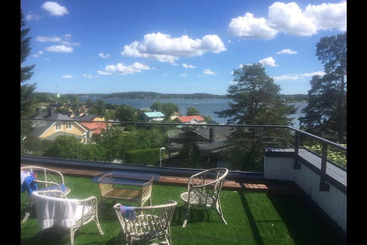 Welcome to our house with large terrace in south and sea view. The house of about 65 sqm is located on Tynningö, an island near Stockholm. The house has 4 beds: a bedroom with double bed and a bedroom with bunk bed. There is a house in garden with 2 beds possible to use in summertime. Fully equipped kitchen with dining area for 6 people and a small bathroom with toilet, basin and shower. Livingroom with fireplace and sea view. Terrace with a table for 6 people, and a barbecue. Big Garden.