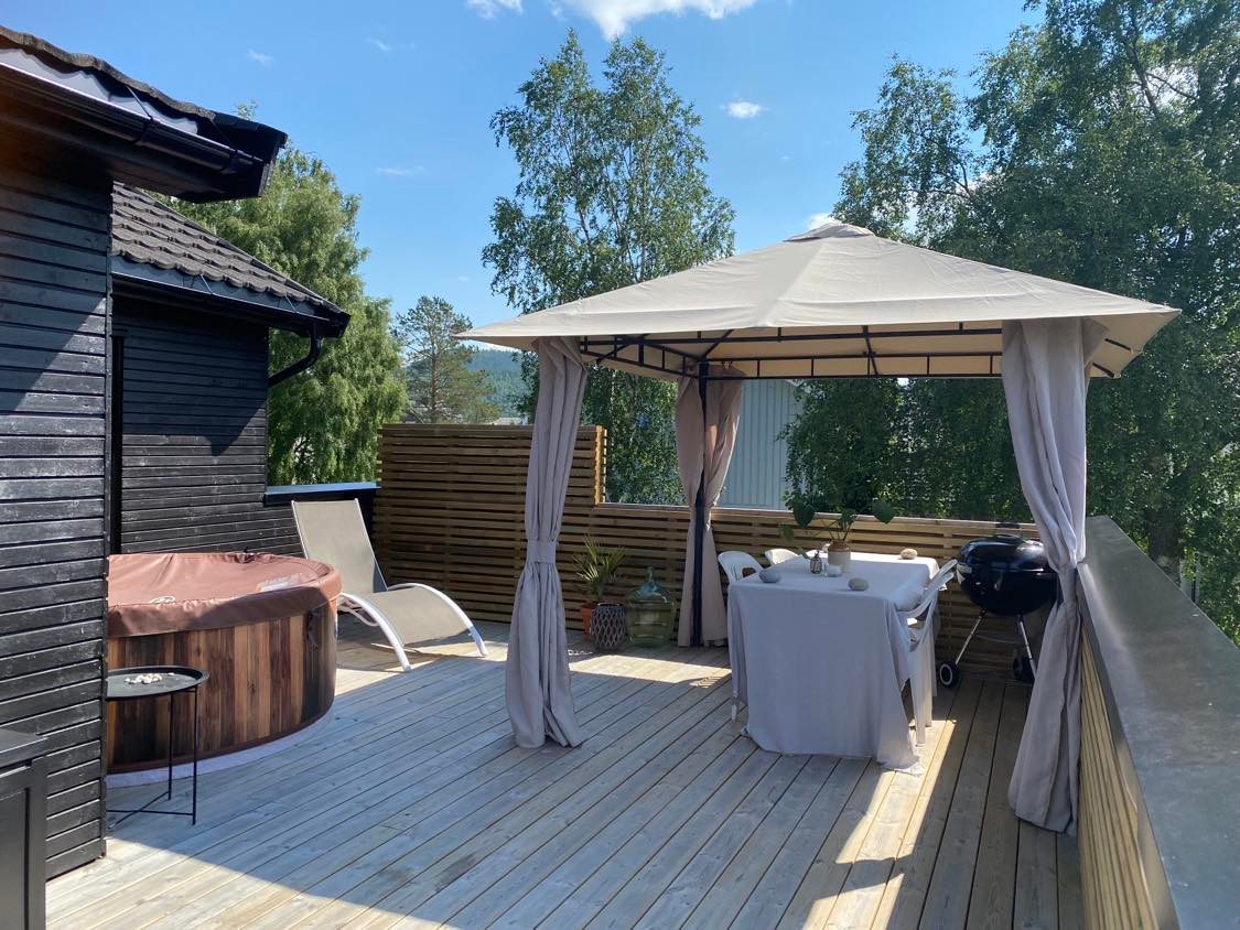 Enebolig over tre etasjer. Første etasje kjøkken, stue, bad og soverom med flere utganger til terrasse og stor hage. Andre etasje 2 soverom, bad og utgang til tilbaketrukket takterrasse med spisested og badestamp. Sengetøy og håndklær inkludert i prisen. Noe er nyere standard og noe er eldre standard. Ta gjerne kontakt for spørsmål.