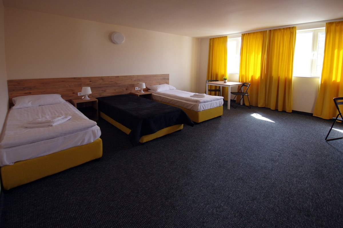 Կացարան մինչև 4 անձի համար - ննջասենյակ - հյուրասենյակ՝ փոքր խոհանոցով և քնելու բազմոցով - լոգասենյակ ՝ ցնցուղախցիկով - պատշգամբ Խոհանոցիկը լիովին կահավորված է պահարաններով, ներկառուցված ջեռոցով, կերամիկական սալիկներով, օդաքարշով, միկրոալիքային վառարանով, սառնարանով, տաք ջրի համար թեյնիկով, տոստերով, սեղանով և աթոռներով։ Յուրաքանչյուր սենյակ հագեցած է հեռուստացույցով։ Սենյակները օդորակված են, և լիակատար հարմարավետության համար բնակարանը հագեցած է ֆենով, արդուկով և արդուկի սեղանով։ - Ստորգետնյա ավտոտնակ - Վերելակ
