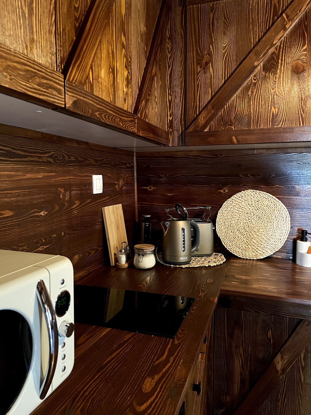 Մեր փայտե տունը պատրաստվել է իմ պապի կողմից 50 տարի առաջ: Այն բաղկացած է հյուրասենյակից, որտեղ կա հրդեհի վայր, ծալովի թախտ 2 հոգու համար, փոքր խոհանոց, լոգասենյակ, իսկ առաջին հարկում կա մեկ ննջասենյակ երկտեղանի մահճակալով և 3 մեկտեղանոց մահճակալով: Մեր փայտե հյուղակում գտնվելու ընթացքում կարող եք տեսնել սկյուռներ, անտառային թռչուններ, բզեզ, սալամանդերներ, ոզնի և տարբեր կենդանիներ... երբեմն եղնիկները գալիս են այցելության: Այն գտնվում է Հարմոնիա հանգստի գոտում ՝ Modra - ի մոտ: