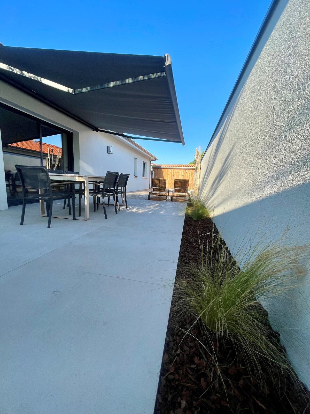 Maison moderne, climatisée, pour 6 personnes avec piscine privée chauffée, jardin et borne de recharge pour voiture électrique. Idéale pour visiter les vignobles des châteaux du Médoc, profiter des plages océanes à moins de 50 km et visiter le centre-ville de Bordeaux à 12 kms. 3 chambres, 2 salles de bains, canapé, cuisine équipée, salon lumineux avec tv connectée, terrasse, transats, barbecue, Wifi et parking. Confort et calme entre océan et vignobles.