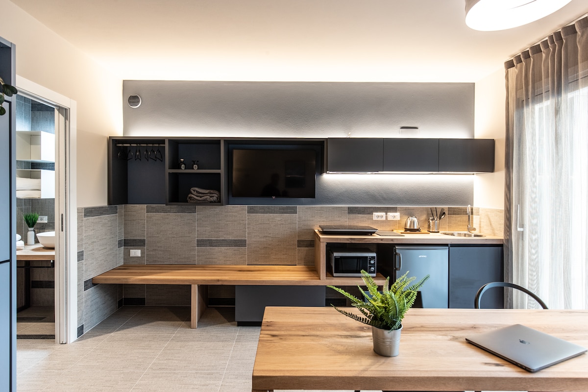Նոր վերանորոգված բնակարան ՝ լիովին կահավորված, պատշգամբներով և օդորակիչով, բնակելի տարածքով, խոհանոցիկով, առանձին ննջասենյակով, թախտով, անվճար Wi - Fi - ով և հարթ էկրանով հեռուստացույցով ։ Տարածքն ունի առանձին լոգասենյակ ՝ ցնցուղով, նրբագեղությամբ և վարսահարդարիչով ։ Տրամադրվում են սպիտակեղեն և լոգարանի սպիտակեղեն ։ Հարմար է բոլոր հիմնական ծառայությունների համար ՝ խանութներ, հացաբուլկեղենի գործարան, դեղատուն, բար, պիցցերիաներ, ռեստորաններ և պաղպաղակի խանութներ ։ Անվճար ավտոտնակ