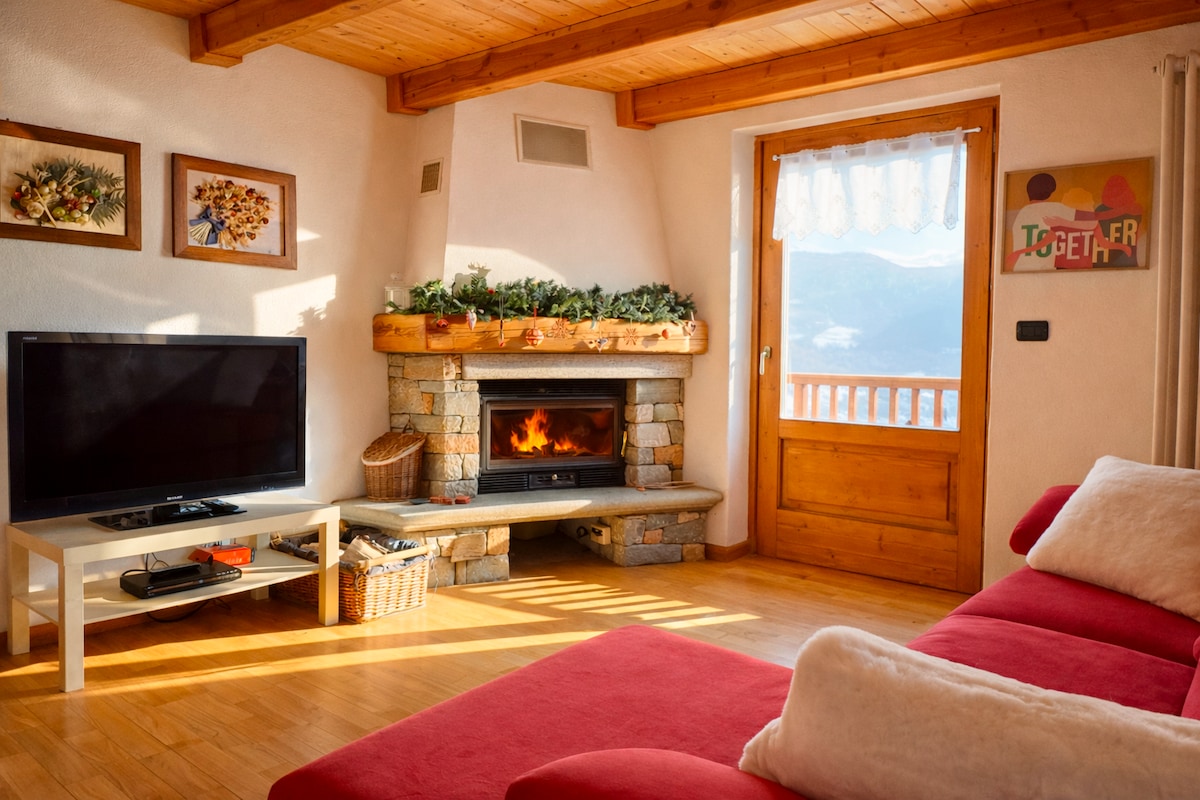 Alps Mountains. Italy. Aosta Valley. A cabin in a small village at 1600 meters,in the peace of meadows, grazing cows and mountains. Snow (usually) in the winter. A place of the heart, lovingly restored preserving the ancient beams of the roof. A wonderful view from the large windows and a special tranquility for those in search of peace, warmth and relaxation. The furniture is very nice: wood above all, but also more lively colors, and modern comforts. Quiet excursions, both on snowshoes or ski.