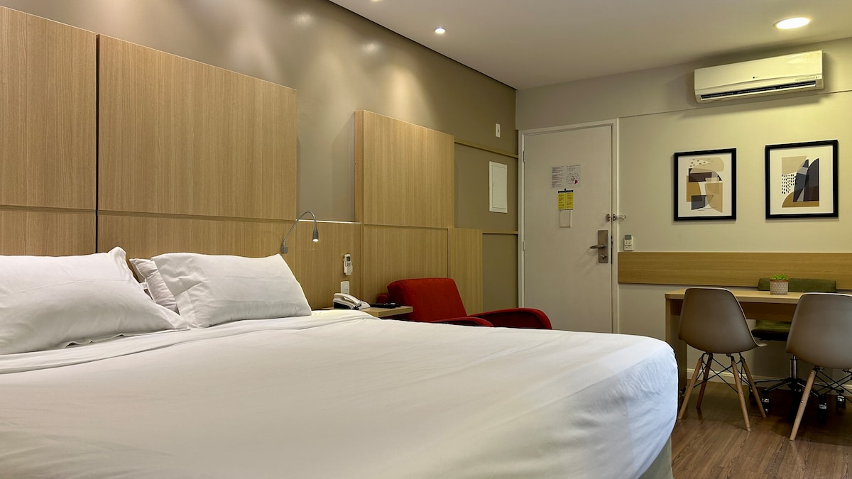Ժամանակակից, հարմարավետ և լավ կահավորված ստուդիա՝ շենքում ավտոկայանատեղիով, որը գտնվում է Սանտու Ամարոյում՝ Չակարա Սանտու Անտոնիու թաղամասում։ Իդեալական է 2 հյուրի համար, որոնք գործնական կամ հանգստի նպատակով են ճանապարհորդում։ Այն ունի պատշգամբ, օդորակիչ, 500 Մբիթ/վ արագությամբ Wi-Fi և 43 դյույման սմարթ հեռուստացույց։ Խոհանոցը կահավորված է Nespresso սրճեփ մեքենայով, վառարանով, միկրոալիքային վառարանով և երկդռնանի սառնարանով։ Կրկնակի մահճակալ՝ պրեմիում դասի 100% բամբակյա անկողնային սպիտակեղենով և Buddemeyer լոգարանի սպիտակեղենով։ Պլանավորված պահարաններ յուրաքանչյուր սենյակում ։