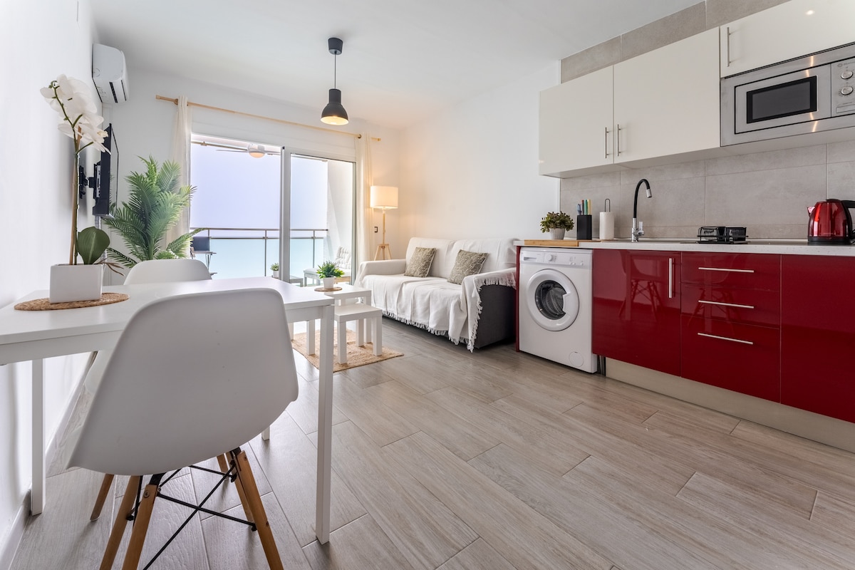 Encantador apartamento en primera línea de playa, con amplia terraza y bonitas vistas al mar. Situado en planta baja dentro de un recinto privado, con acceso a parking (excepto julio, agosto y septiembre) y ducha exterior Cocina abierta al salón totalmente equipada: inducción, lavavajillas, tostadora, cafetera Nespresso y hervidor de agua. Salón con sofá cama para dos personas y zona de trabajo/estudio. Aire acondicionado/bomba de calor, wifi, Smart TV y persianas en todos los ventanales.