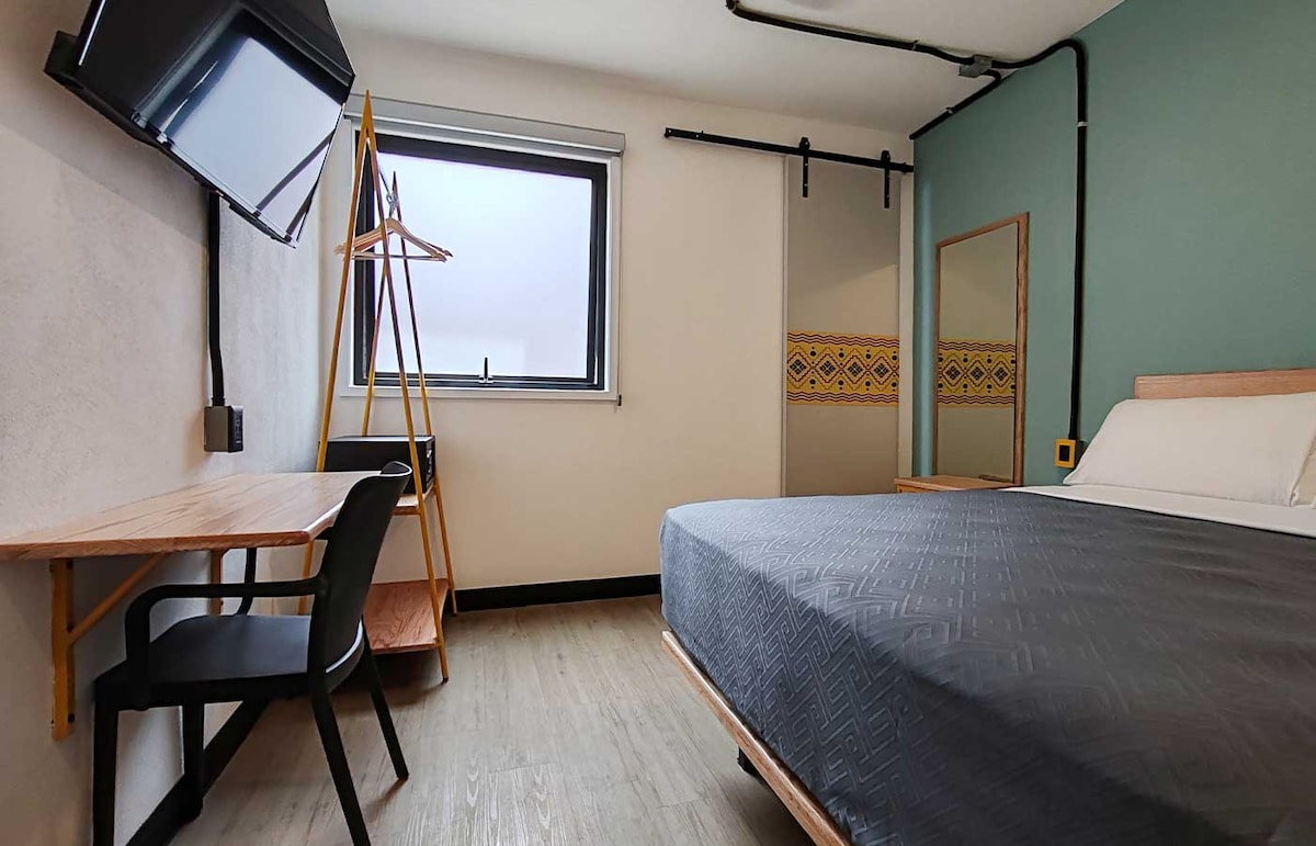 Stay in the heart of Santa María la Ribera, one of Mexico City’s most authentic and laid-back neighborhoods. Our cozy room is part of a renovated, 1926s Mexican townhouse— central to everything, yet super tranquil. You’ll have your own comfy space plus access to the living room, shared kitchen, a sunny rooftop, and a dedicated workspace. Full-sized washer/dryer available. This room is an interior room next to the water fountain.