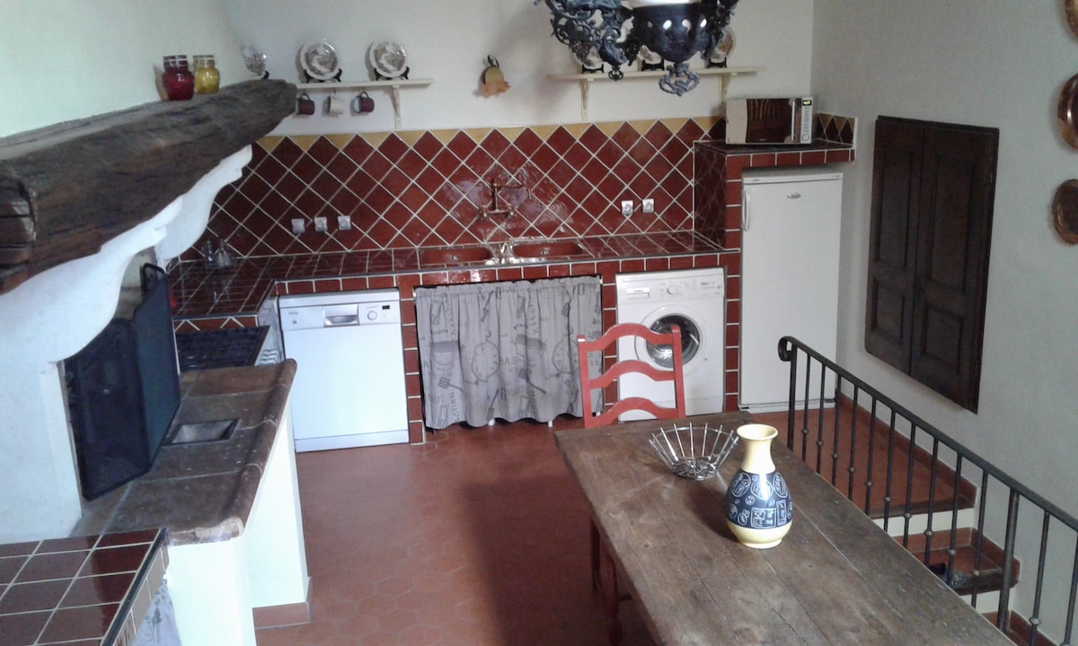 30 մ² ինքնամփոփ ստուդիա հին Պրովանսալ տանը անշարժ գույքի վրա աղբյուր Ագարակ, ինքնաթիռի ծառեր, ձիթապտղի ծառեր, որթատունկ և հանգիստ. ամեն ինչ կա հանգստանալու համար: Վերանորոգված բնակարանը բաղկացած է մուտքից ՝ լվացքի մեքենայով, հիմնական սենյակ ՝ ինտեգրված խոհանոցով ջեռոց, ջեռոց, միկրոալիքային վառարան, սառնարան, սառցարան, սրճեփ, ամանալվաց մեքենա, BZ բազմոց, LED հեռուստացույց - Այնուհետև ալարկոտեք շատ լավ անկողնային պարագաներով 140 x 200 ։ Լոգասենյակ ՝ մեծ ցնցուղով ։ WC ։
