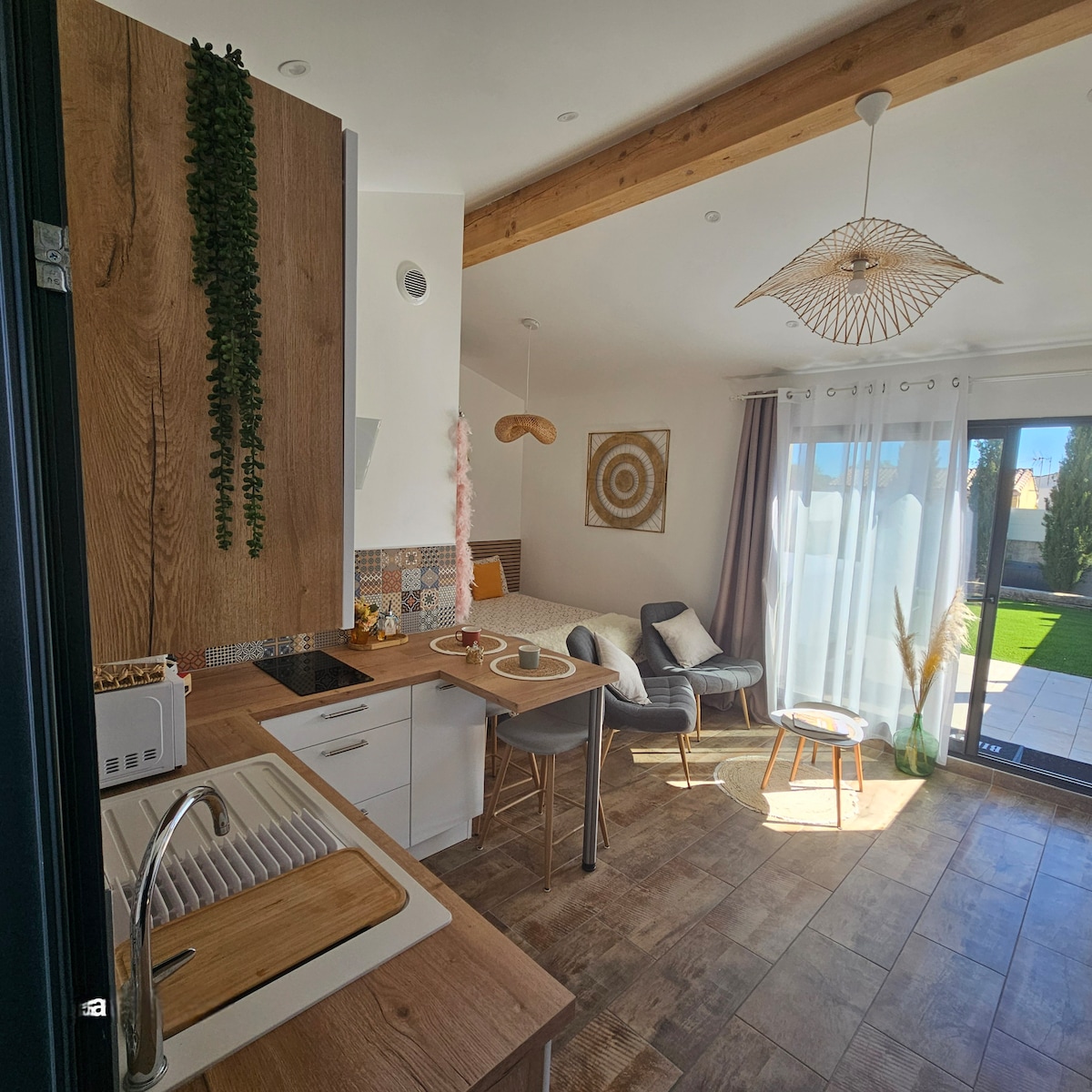 Accommodation located in a quiet residential area just five minutes from Carcassonne. Our cozy retreat can accommodate one to four guests in a peaceful setting. It features a private entrance, a private terrace, and free, secure parking visible directly from the accommodation, offering real peace of mind. Comfortably equipped, it provides a warm and functional atmosphere, ideal for a tourist, business, or relaxing stay.