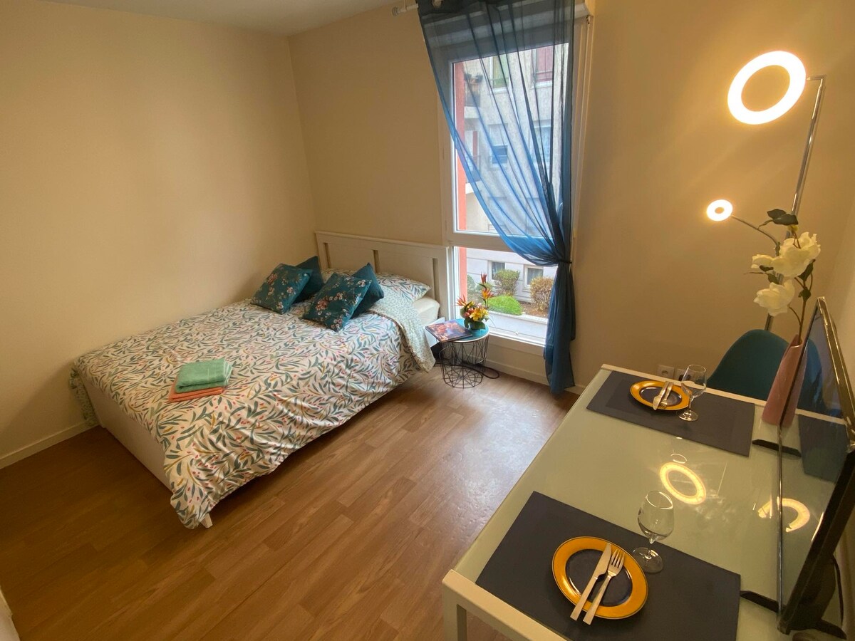 Հոյակապ 20 մ2 մակերեսով ստուդիա, որը գտնվում է կենտրոնում, հարմարավետ և ֆունկցիոնալ, ստորգետնյա կայանատեղիով: Իդեալական է, մոտ է T3 տրամվայի կանգառի Reconnaissance - Balzac - Gare Part - Dieu 10 րոպե (2 կանգառ) Սեփականության մոտ գտնվող ավտոբուսային գծեր, տարբեր խանութներ (հացաբուլկեղենի գործարան, սուպերմարկետ և այլն) Առանձին կայանատեղ նկուղում և լվացքատուն ։ Շատ գերարագ Wi - Fi ՝ կացարանում Լիովին կահավորված խոհանոց + լոգասենյակ Տրամադրվում են սավաններ, զուգագուլպաներ, լոգարանի սրբիչներ ։