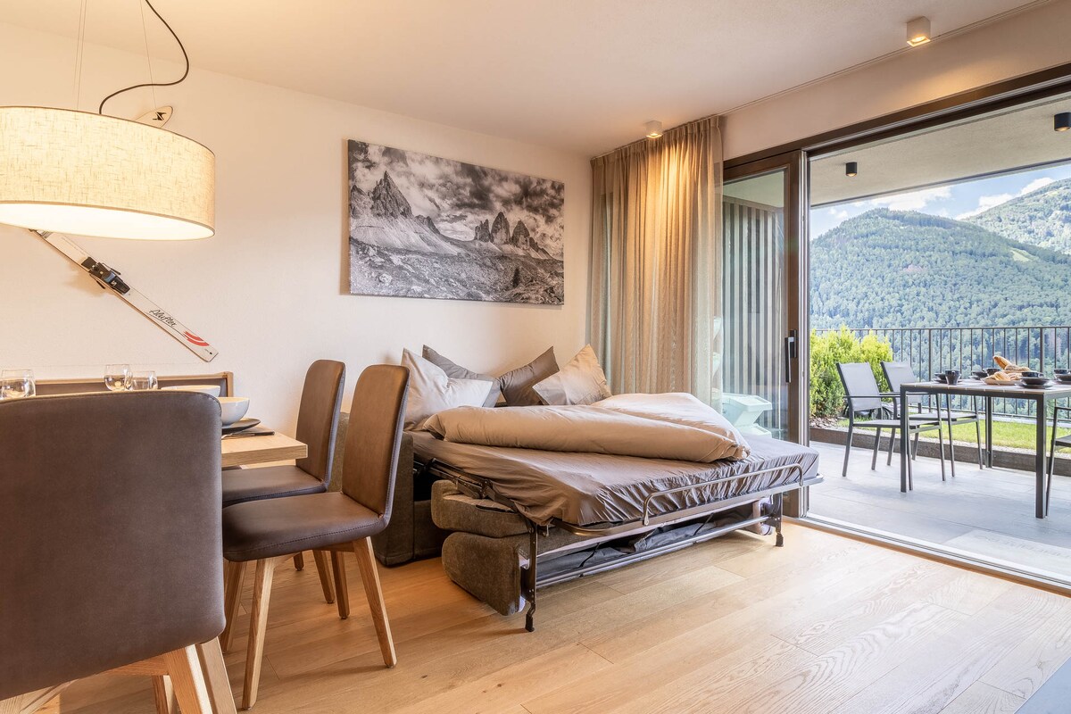 Մեծ բնակարան ՝ հատակից մինչև առաստաղ պատուհաններով, բաց լոգասենյակով և դեպի Դոլոմիտներ բացվող տեսարանով ։ Հարավում գտնվող արևոտ պատշգամբ կամ կտուր / հատակից մինչև առաստաղ պատուհաններ / հյուրասենյակ ՝ բազմոցով/ HD LED հեռուստացույցով / լիովին կահավորված ֆիրմային խոհանոցով / մեկ ննջասենյակ ՝ մեծ մահճակալով / լոգասենյակ ՝ ներս մտնող անձրևանոցով/ WC և բիդե առանձնացված / գերարագ WI - FI / 48 մ²/ 1 -2 անձ: ՍՊԱ ՝ գոլորշու լոգարան, ֆիննական և բիո սաունա, սառը ջրով լողավազան, հանգստի գոտի, XXL անեզր մրրիկ, լողավազան ։ CrossFit Box – Մարզասրահ ։