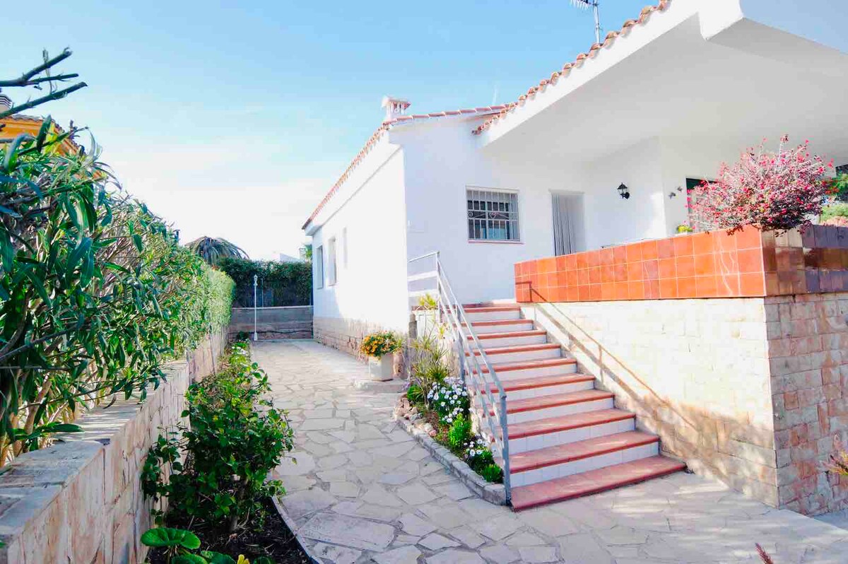 ☀️🏊♂️🏄♀️🪸Lleva a la familia o a tus amigos a este fantástico alojamiento,práctico, bonito,recién decorado y con nueva gestión. Chalet INDIVIDUAL,de dos plantas,vallado,con DOS TERRAZAS amuebladas,cuidado jardín privado de 300 m2, WIFI, PORCHE con BARBACOA,COMEDOR-SALÓN Y CHILL OUT. Situado en una urbanización tranquila, 2PLAZAS APARCAMIENTO, JACUZZI,parque INFANTIL,petanca, estanque y 4000m2 de césped y jardines alrededor de la GRAN PISCINA. SÁBANAS,TOALLAS, GEL I CHAMPÚ incluídos BICI