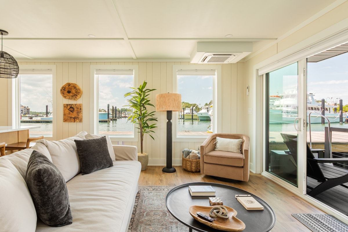 FLOHOM 10 | Rudee Retreat is a modern coastal-designed luxury houseboat at the Virginia Beach Fishing Center on Rudee Inlet. King bed with Parachute linens, queen sleeper sofa for four guests, fully equipped kitchen, and Starlink WiFi. Rooftop fire pit, 8-seat dining, sectional sofa, and views across the inlet. Walk to the beach, boardwalk, fishing charters, dolphin tours, and watersports. Complimentary parking. Where the inlet meets the ocean, and the sand meets the dock. ✨