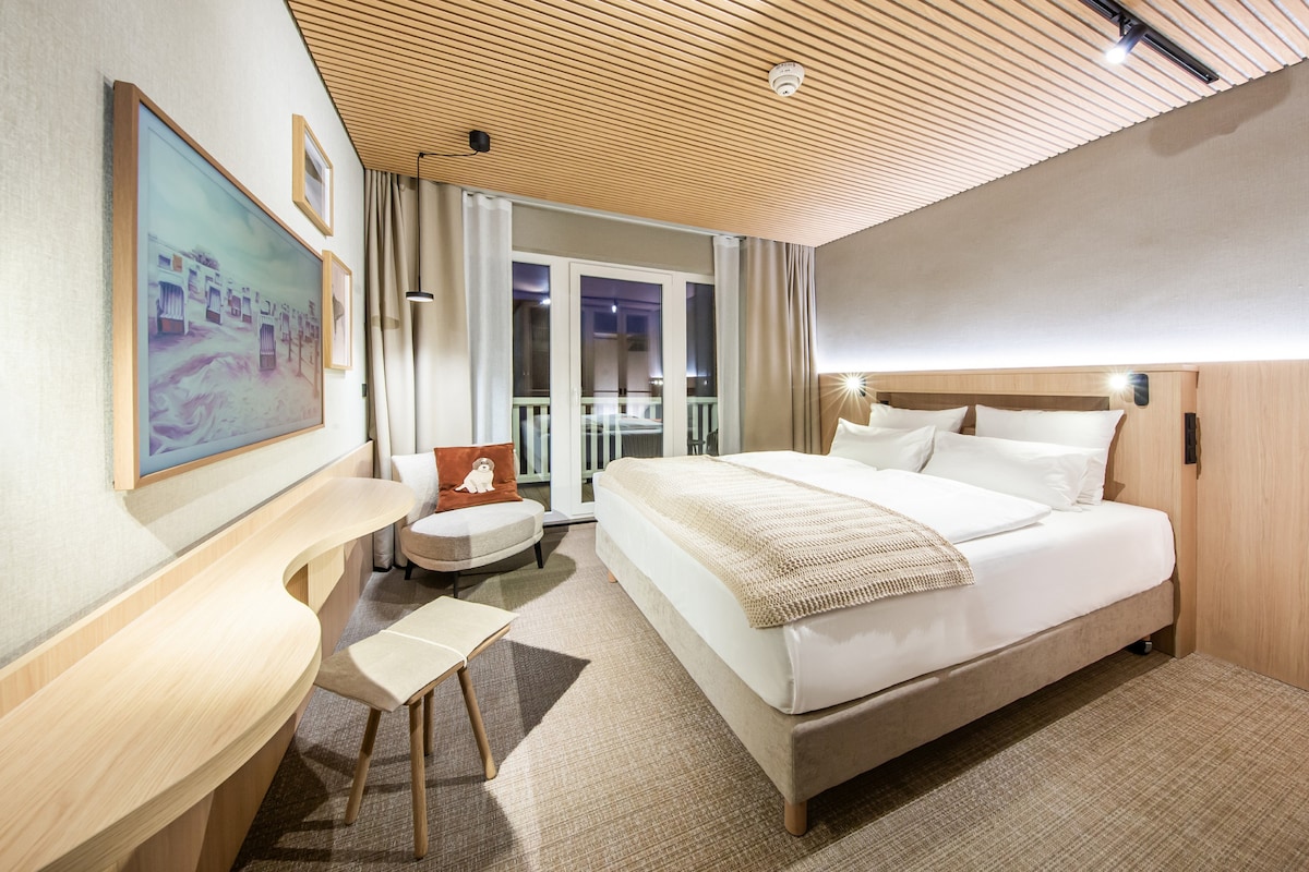 Dein Rückzugsort nach einem langen Tag am Meer. Die Kleine Bude besticht durch ihr klares Design und bietet auf über 20 m² alles, was du zum Entspannen brauchst. Das Herzstück ist das neue 180 cm breite Boxspringbett (Sitzhöhe 64 cm), das erstklassigen Schlafkomfort garantiert. Atme auf deinem eigenen Balkon tief durch, genieße Kunst oder Kino auf dem Samsung „The Frame“ TV und starte erfrischt im modernen Bad mit Dusche in den Tag.