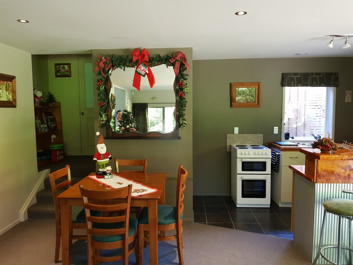 Այս պայծառ, ընդարձակ և խաղաղ տնակը հոլանդական ամբարի վերափոխված հատված է, որը տեղադրված է ուռենու ծառերով շրջապատված գեղեցիկ փոքրիկ պարտեզում ։ Հիանալի զբոսանքներ կան շեմից ՝ գետաբերանի շրջակայքում, որը գտնվում է ճանապարհին և Օմոկորոա ցիկլով ։ Մերձատար ճանապարհի վերևում կգտնեք թիավարը ՝ մեր երկու ալպականերով և դրա միջով անցնող փքուն հեղեղով ։ Տնակում կա փոքր ջեռոցով, մեկ ինդուկցիոն գազօջախով և միկրոալիքային վառարանով խոհանոց ։ Արագ Wi - Fi - ը ներառված է ։