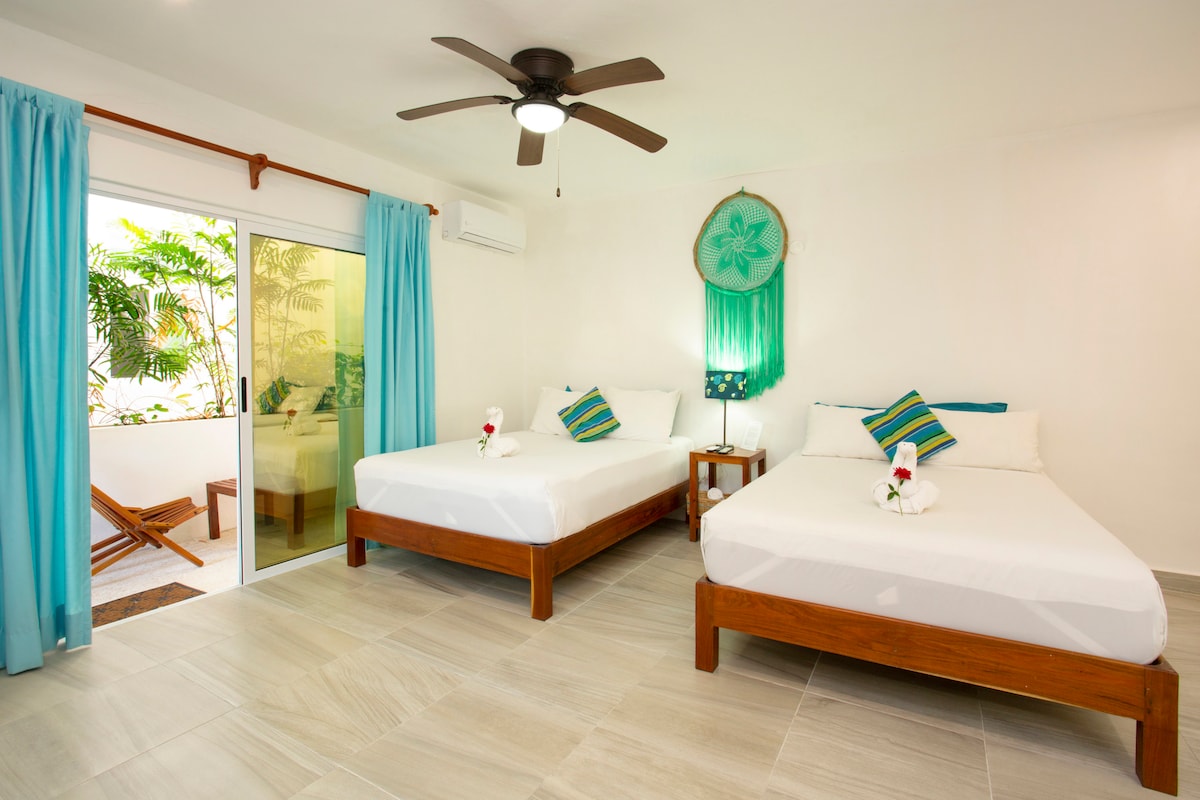 At Barrio Latino, each unit blends adobe tones, hammocks, and handcrafted details that reflect the charm of traditional Mexico. Our two-story space, surrounded by gardens, lets in the Caribbean breeze and the sounds of the night. Relax on your private terrace, enjoy the common areas, and take advantage of the fast Wi-Fi. We offer 24-hour reception, luggage storage, parking (subject to availability), and a Tesla charger to make your stay comfortable and worry-free.