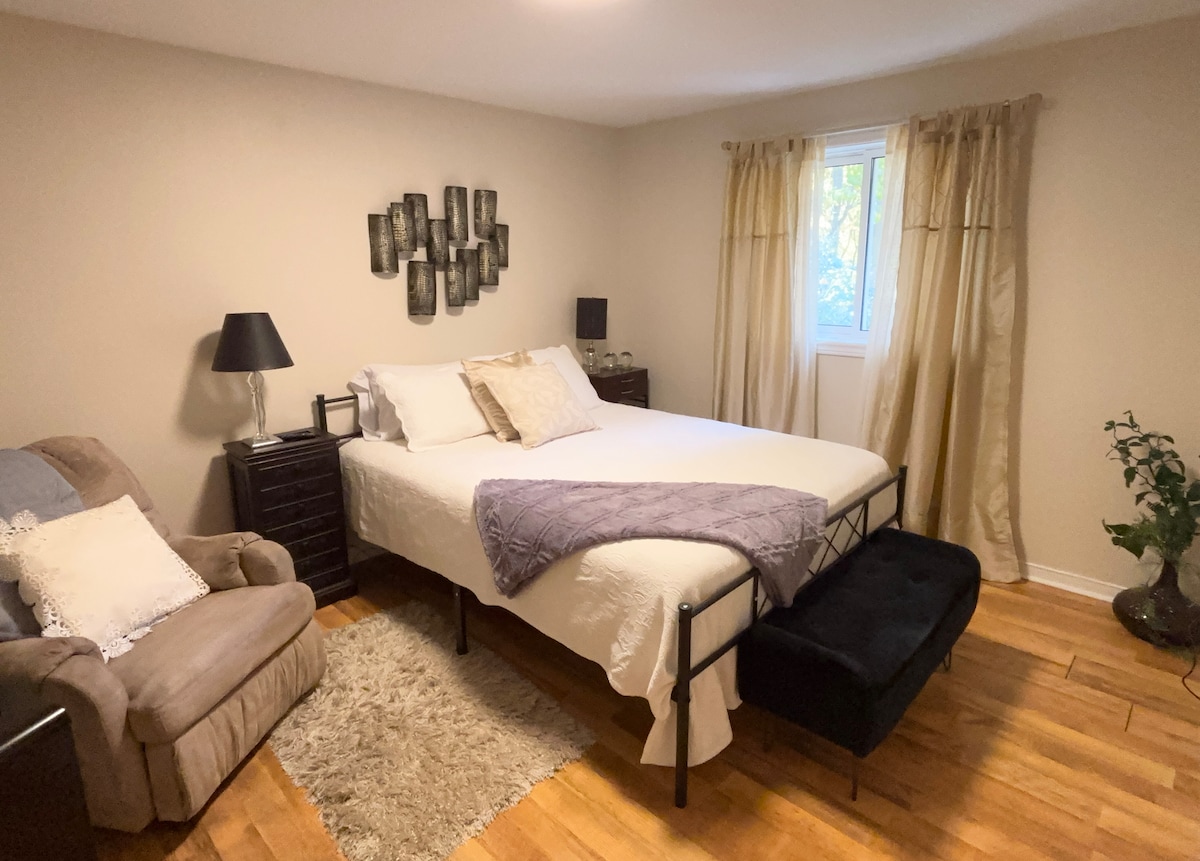 Լիցենզիա № 25-308528 Ժամանակակից 1 սենյականոց բնակարան Գուելֆ Վեսթ Էնդում գտնվող ընտանեկան տան ներքևում ։ Մեքենայով ~2 րոպե մինչև Կոնեստոգայի քոլեջ Մեքենայով ~5 րոպե մինչև Rec Centre, Costco, Zehrs Մեքենայով ~10 րոպե մինչև համալսարան, Կենտրոն, Սթոուն Ռդ Մոլ Ոտքով ~2 րոպե մինչև կանգառ - Անվճար 1 կայանատեղ մերձատար 🅿️ ճանապարհին+ փողոցային կայանատեղի ապրիլ - դեկտեմբեր Իսկական տուն ՝ տնից հեռու. *լիովին կահավորված/կահավորված խոհանոց և լոգասենյակ *լվացքի մեքենա/չորանոց *երկտեղանի մահճակալ, 2 թախտ *աշխատանքային գրասեղան Հյուրընկալողներն ապրում են հարկաբաժնից վերև և անհրաժեշտության դեպքում հասանելի են, բայց նաև տրամադրում են ձեզ գաղտնիություն