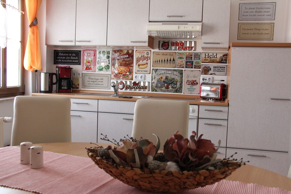 Հարգելի հյուրեր, Ես մոտ 50 քառակուսի մետր մակերեսով գեղեցիկ բնակարան եմ վարձում Գերմանիայի կանաչ սրտում ՝ Յենայի և Վայմարի մոտակայքում ։ Կա հյուրասենյակ, խոհանոց, լոգասենյակ և ննջասենյակ ։ Քնելու հարմարությունները ննջասենյակում երկտեղանի մահճակալ են, իսկ հյուրասենյակում ՝ 1 անձի համար նախատեսված բազմոց ։ Առկա է 4 - րդ քնելու համար նախատեսված լրացուցիչ ներքնակի հնարավորություն ։ Խոհանոցը լիովին կահավորված է, իսկ հյուրասենյակի ճաշասեղանն առաջարկում է հանգիստ երեկոների հնարավորություն ։