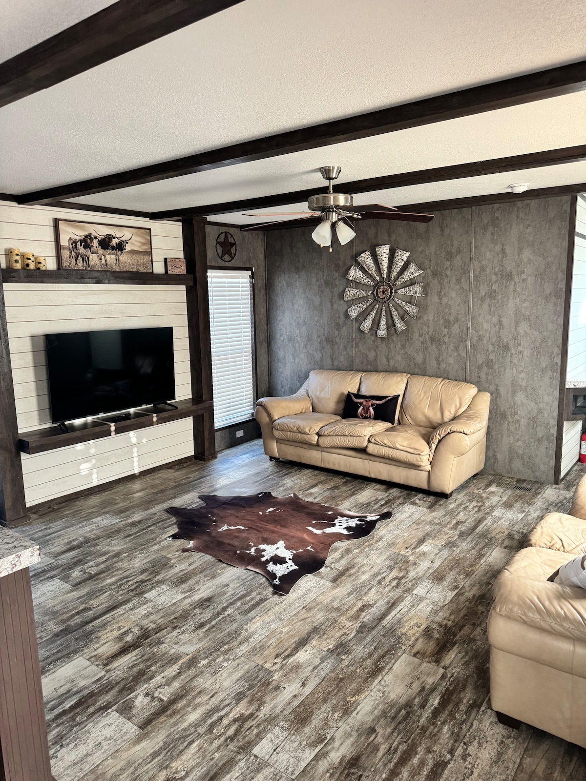 This stylishly finished home offers a tranquil and relaxing vacation experience in the finest tradition of West Texas hospitality. The home can comfortably sleep 6 adults plus one extra if you convert the living room couch to a bed. It comes with a 75 inch smart TV in the living room and a 65 inch in the master bedroom. Many amenities essential for maximum comfort are present.