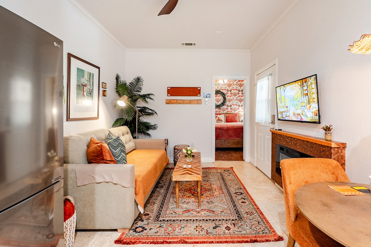 The Travelers Retreat Casita has all you’ll need to feel spoiled, including a Cal king bed with super soft bedding for the best nights sleep. Cook your own meals in our stocked kitchenette and full size refrigerator. The living room has a sofa that converts to a queen bed with a 3 inch latex topper. You must request for it and an extra guest fee applies. Also we have 2-TV’s with wifi and a washer dryer for your convenience. It’s all in the details and you will love all the amenities too.