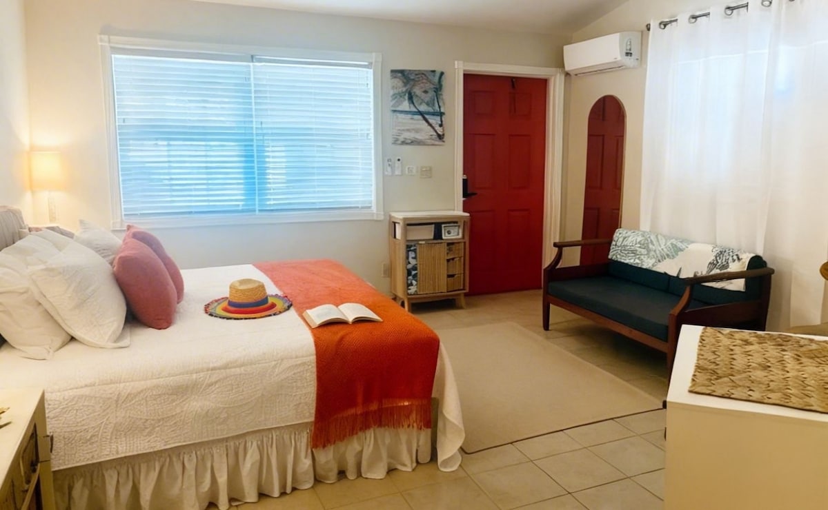 Walk out the door, then down 3 steps to the beach. Simple as that! We have 1 bedroom with king bed and full bath. Along with another full bath and kitchen and living room. There is a covered patio in front facing the water. Our Diamond Palm Villa is part of the Hideaways Resort. Our guests are entitled to use all resort amenities. The onsite bar/restaurant Splash is only a 1 minute walk either by beach or sidewalk. Additional restaurants are right next door. Visit us!!