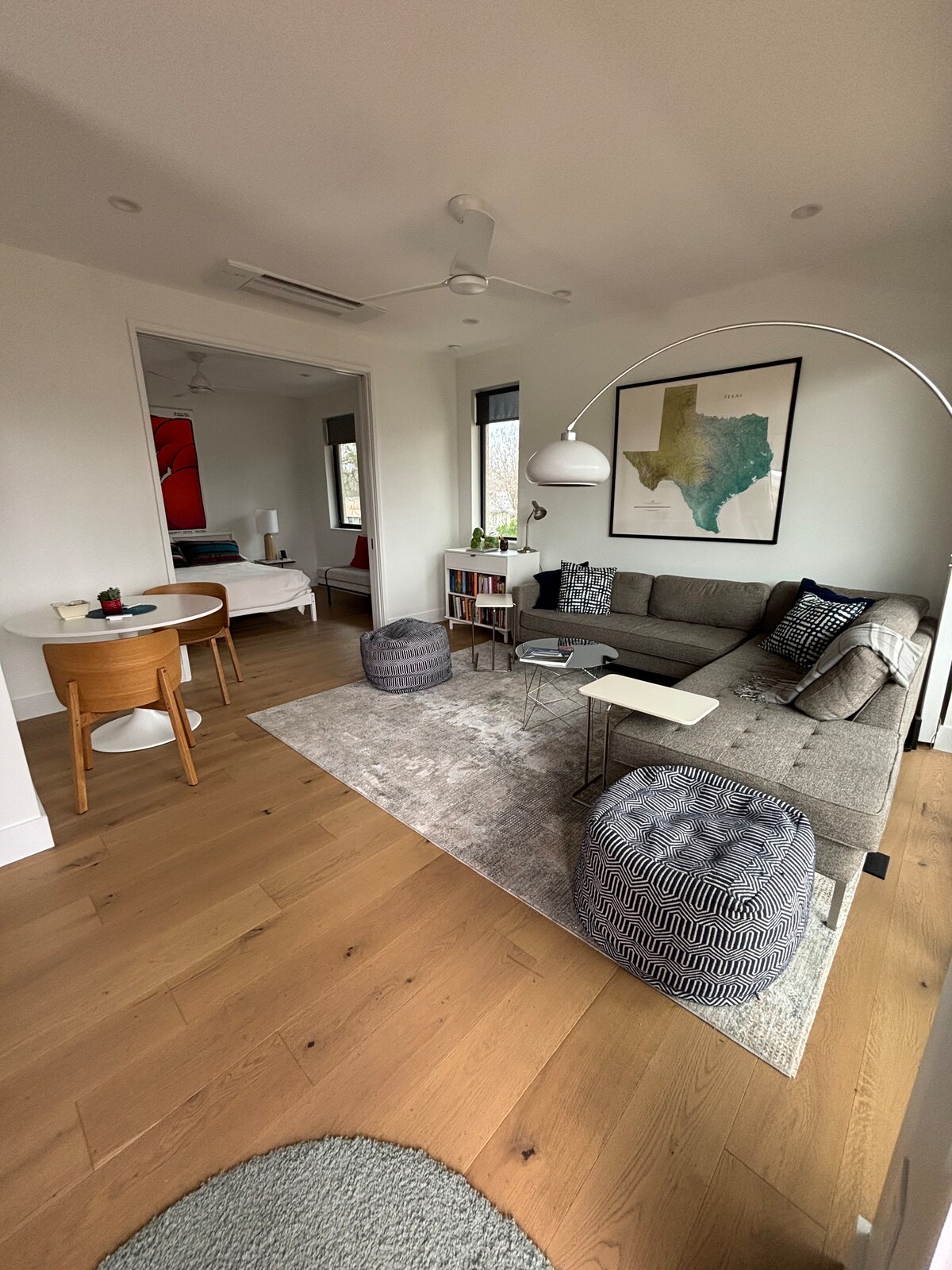 Փորձեք իսկական Օսթինի կյանքը մեր ժամանակակից արևով լի հետնաբակի հյուրերի առանձնաբաժնում ։ Մենք նախագծել ենք մեր ստուդիական լոֆթը ՝ ժամանակակից, հարմարավետ և ցուցադրելու մեր դիզայնը, ինչպես նաև այլ տեղացի արհեստավորների ։ Այն գտնվում է Օսթինի հյուսիսում գտնվող մեր տան հետևում ՝ հանգիստ, բայց քաղաքային թաղամասում ։ Վայելեք անկախ բիզնեսները ոտքով հեռավորության վրա կամ գնացեք քաղաք ՝ ամեն ինչ արագ 10 -15 րոպե հեռավորության վրա: Հյուրերի առանձնաբաժինն ունի բազմաթիվ հարմարություններ, սեփական մուտք և բացօթյա այգի ։