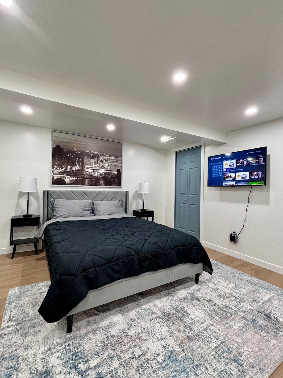 Welcome to my inviting Airbnb listing! Discover my one-bedroom basement suite with a private washroom, dining area, and living room. Enjoy a cozy retreat with a small working space table in the bedroom. Your privacy is ensured with a separate access door equipped with a keypad. The kitchen on the main floor is the only shared space, ensuring exclusive access to the basement amenities. Conveniently park up to two vehicles during your stay. Relax and unwind in this charming space!