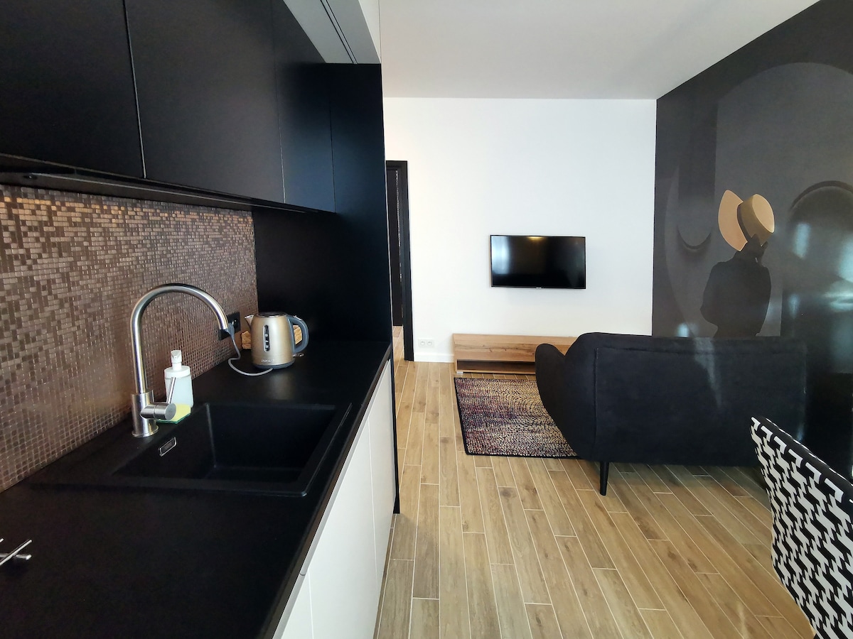 Հարմարավետ, լիովին կահավորված բնակարան նոր շենքում ։ Հյուրասենյակ ՝ բաց խոհանոցով, որը բաժանված է ճաշասենյակի և նստատեղի ։ Ննջասենյակում կա մեծ մահճակալ և ընդարձակ զգեստապահարան: Կա նաև ներս մտնող պահարան ՝ որպես լրացուցիչ պահեստային տարածք ։ Մոտակայքում կան խանութներ, ռեստորաններ և սրճարաններ Սարքավորումներ ՝ օդորակիչ, էսպրեսո մեքենա, թեյնիկ, արդուկ, արդուկի սեղան, լվացքի մեքենա Ուղևորություն Շոպենի օդանավակայանից 20 րոպե տևողությամբ տաքսի 50 րոպե շփում մոդլինի օդանավակայանից 50 րոպե տևողությամբ տաքսի 120 րոպե տևողությամբ շփում