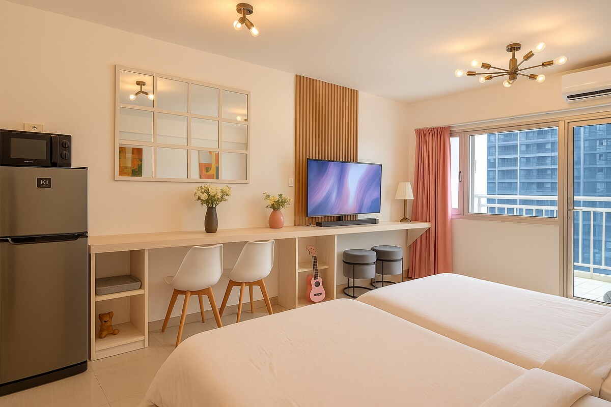 Հարմարավետ 1BR կոնդոմինիում ՝ պատշգամբով | 200 Մբիթ/վ Wi - Fi | Հանգստավայրի ոճով Մնացեք լիովին կահավորված, օդորակիչով 26 քմ մակերեսով կոնդոմինիումում ՝ առանձին պատշգամբով, որն ապահովում է հարմարավետություն, առանձնություն և տան զգացողություն ։ Վայելեք 200 Մբիթ/վ գերարագ ինտերնետ, որը կատարյալ է հեռավար աշխատանքի, տեսազանգերի, հոսքային հեռարձակման և առցանց առաջադրանքների համար ։ Գտնվելով Ասիայի առևտրի կենտրոնում ՝ առողջարանային ոճի շունչ ունեցող, այս տարածքն իդեալական է զույգերի, միայնակ ճանապարհորդողների (հանգստի կամ բիզնեսի) կամ փոքր ընտանիքների համար, որոնք փնտրում են հանգստացնող, բայց արդյունավետ այց ։
