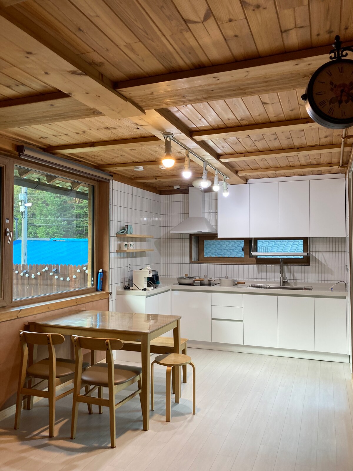Dongsan Beach just a minute walk away. A fusion modern-traditional Korean house comprised of 3 bedrooms, 1 bathroom, spacious living room, fully equipped kitchen, green grass and wooden patio. Barbecue equipment available. Exclusively for a private house rental. Ride the waves, gather sea shells, enjoy fireworks and more in Yangyang!